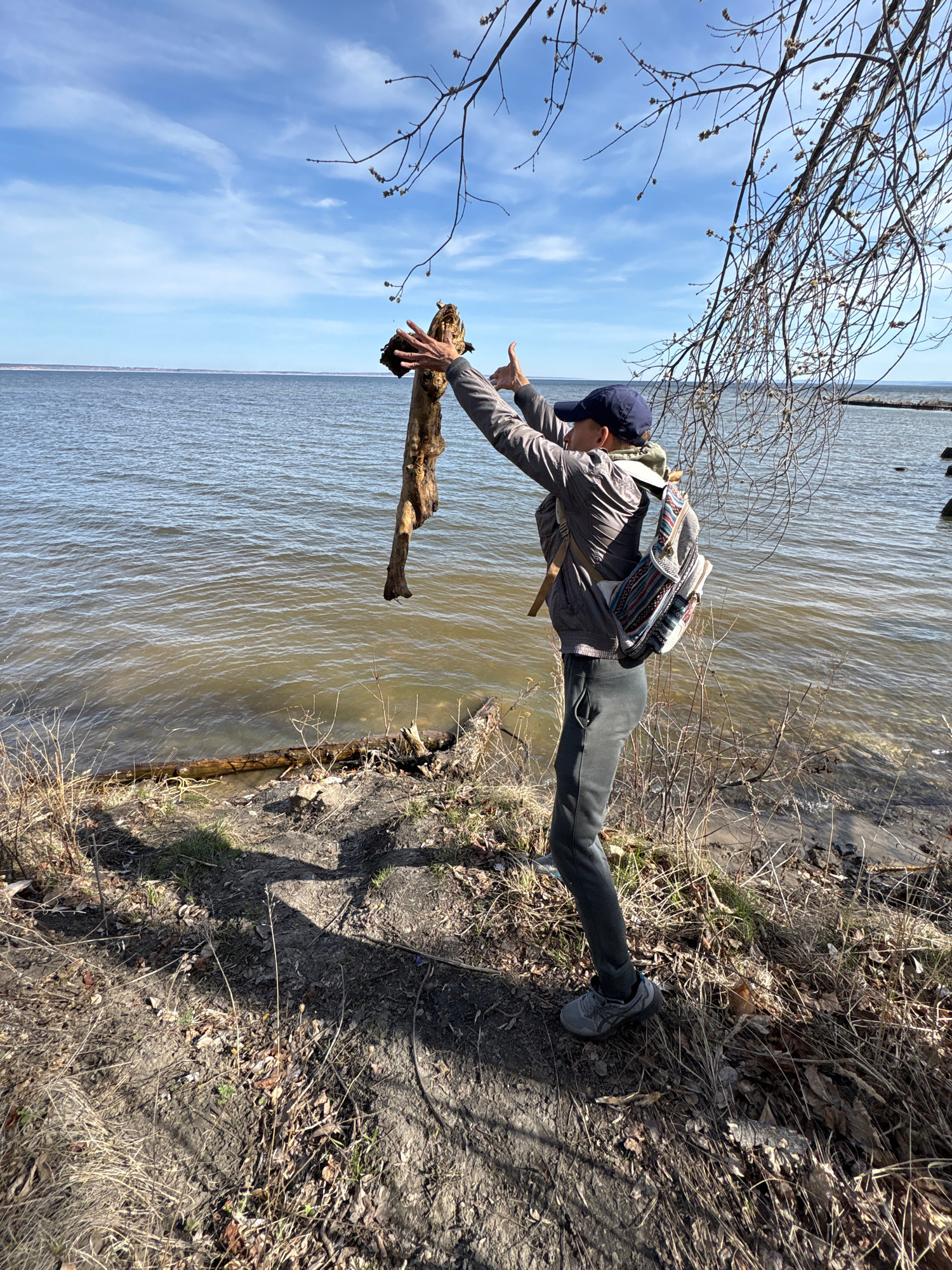 The image depicts a person interacting with a natural environment by a large body of water, likely a lake or river, in Ulyanovsk, Russia. The subject, a person wearing a grey long-sleeved jacket, darkβ¦read more