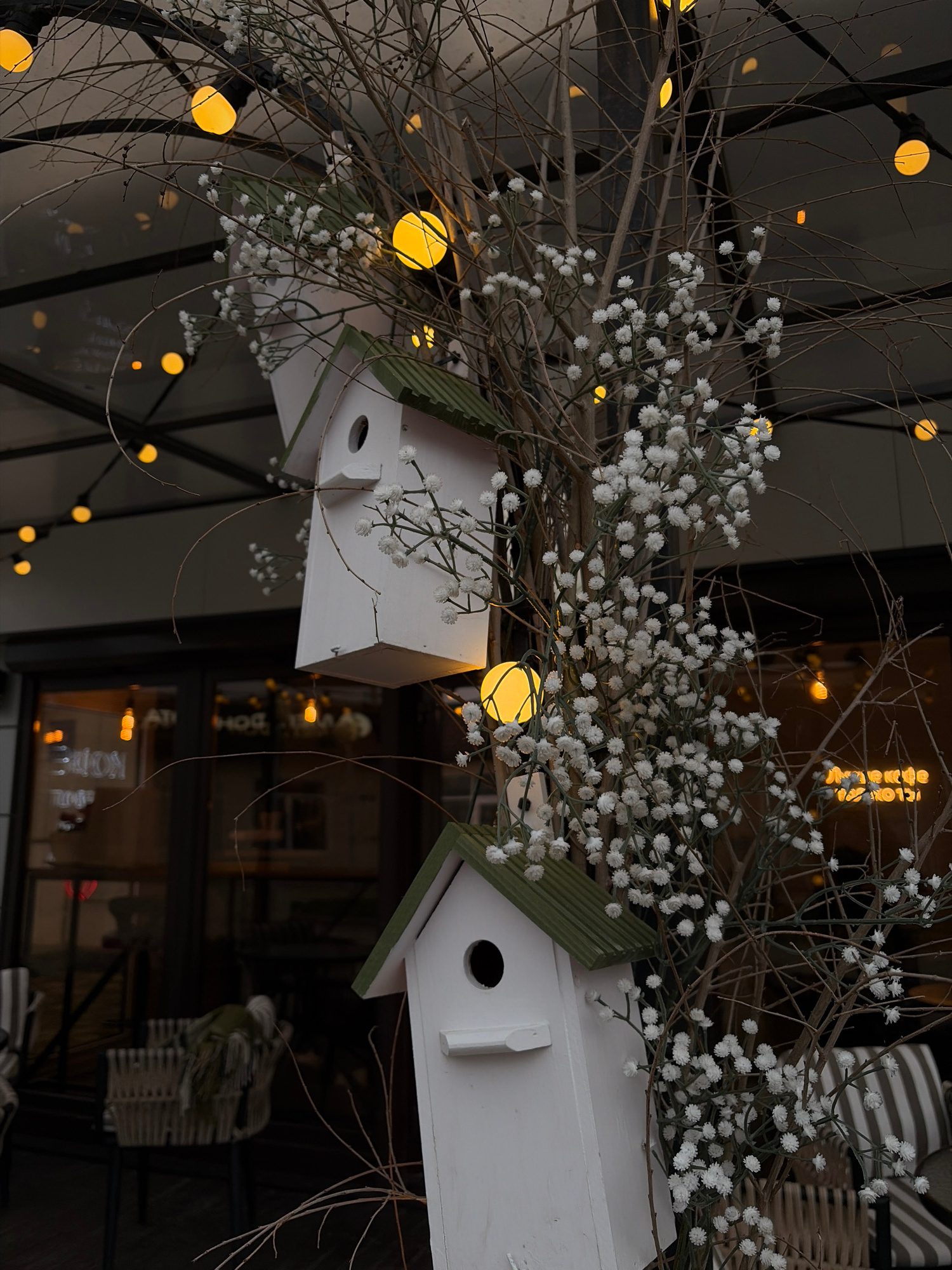 This upward-angled close-up photograph captures a decorative indoor display, likely in a cafe or public establishment in Novopokrovskaya, Russia. The main subjects are two white wooden birdhouses with…read more