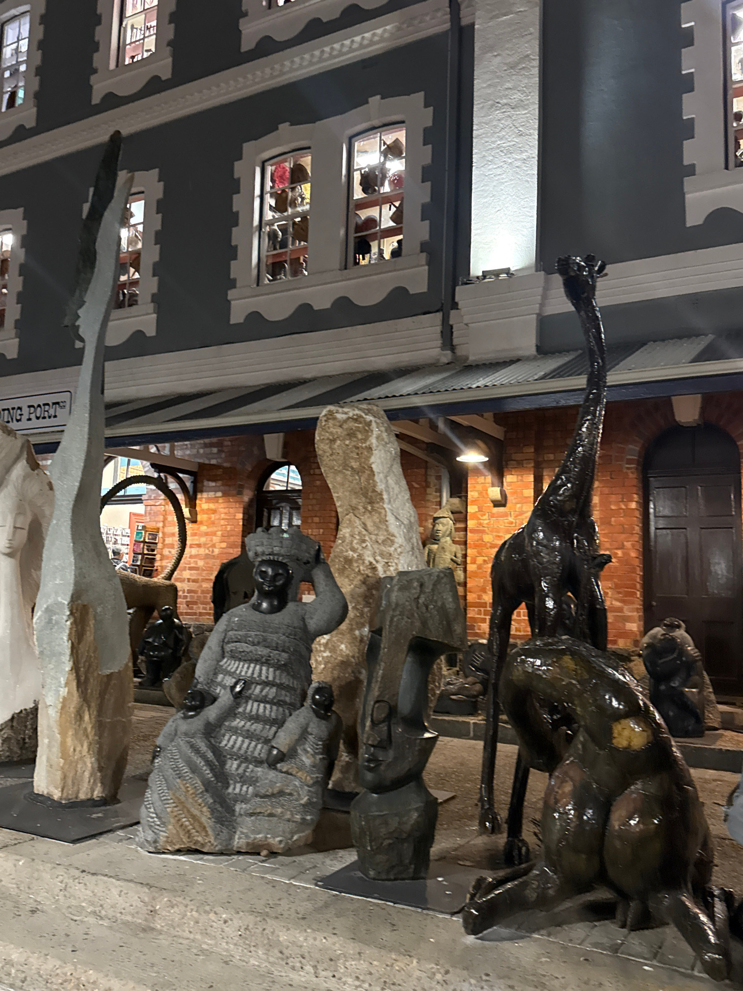 The image shows a collection of sculptures in an outdoor display. Prominent among them are a bronze sculpture of a giraffe and another of a quadruped, possibly a bull or similar animal. Other sculptur…read more