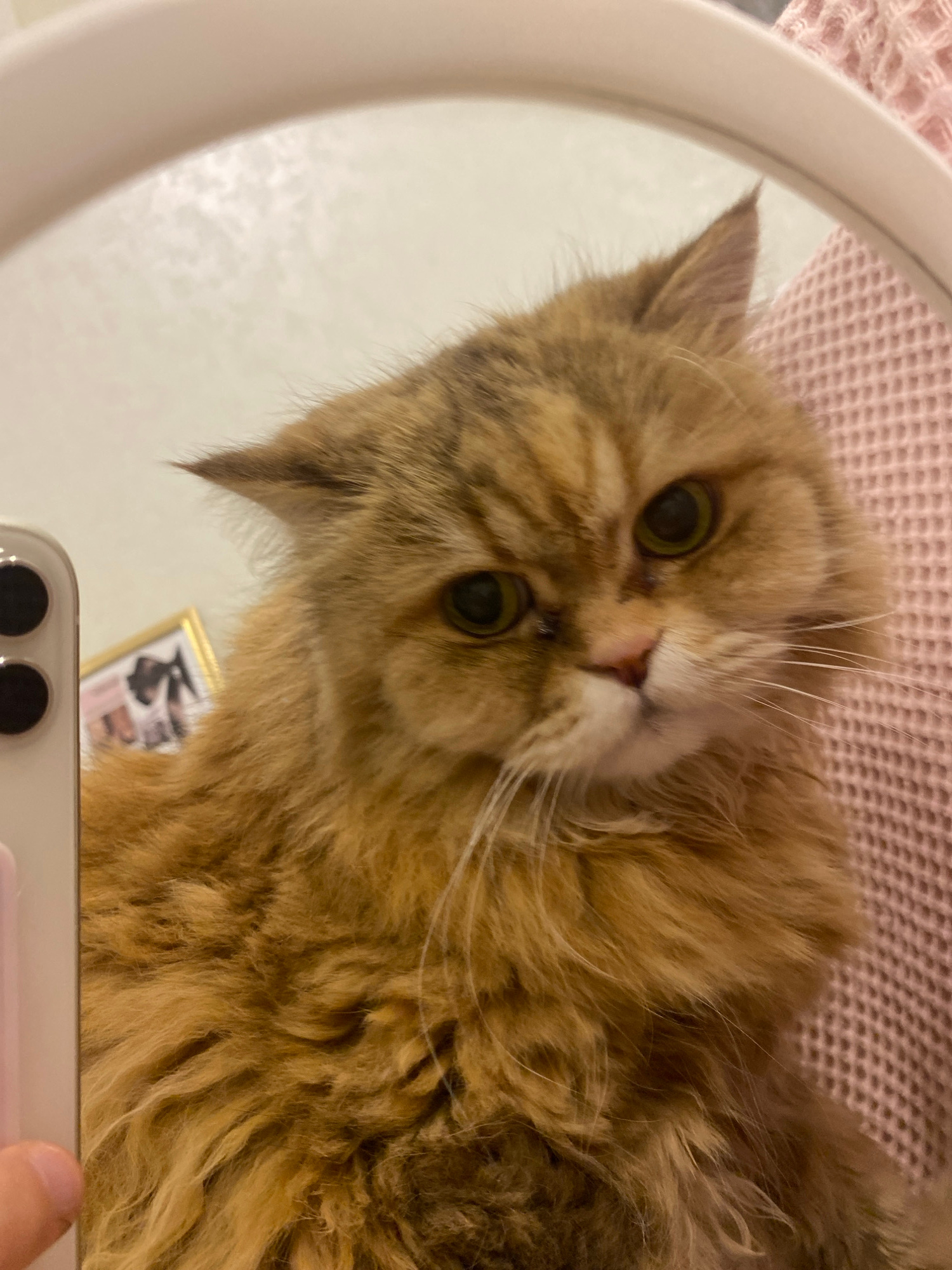 The image shows a fluffy, golden-brown cat with green eyes looking directly at the camera, its face partially obscured by what appears to be a mirror or reflective surface held by someone below. The m…read more
