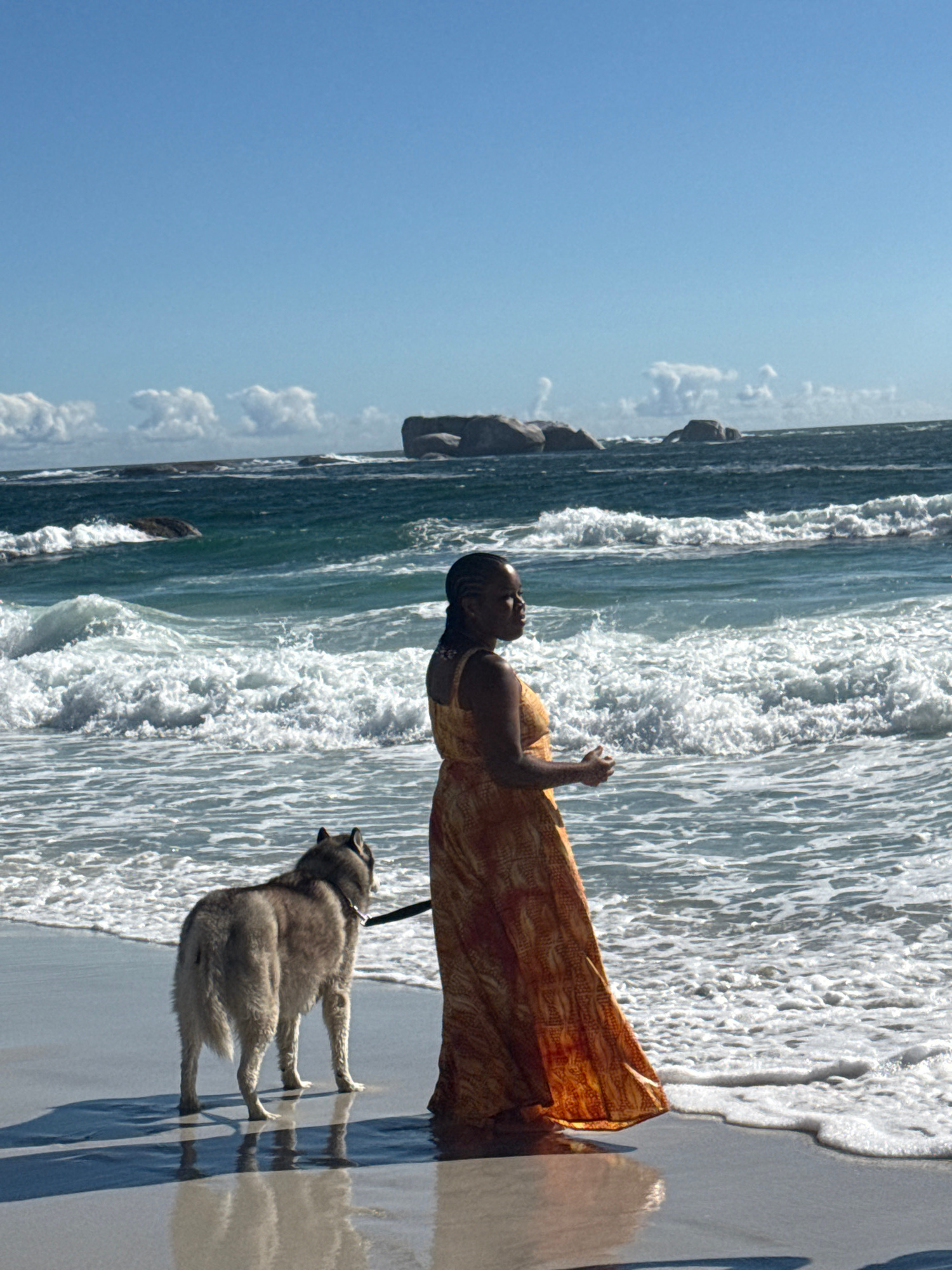 A woman in an orange dress stands at the water's edge with a dog on a leash at a beach in Cape Town, South Africa. The beach has white sand and the water is a foamy blue. Rocks are in the water off sh…read more