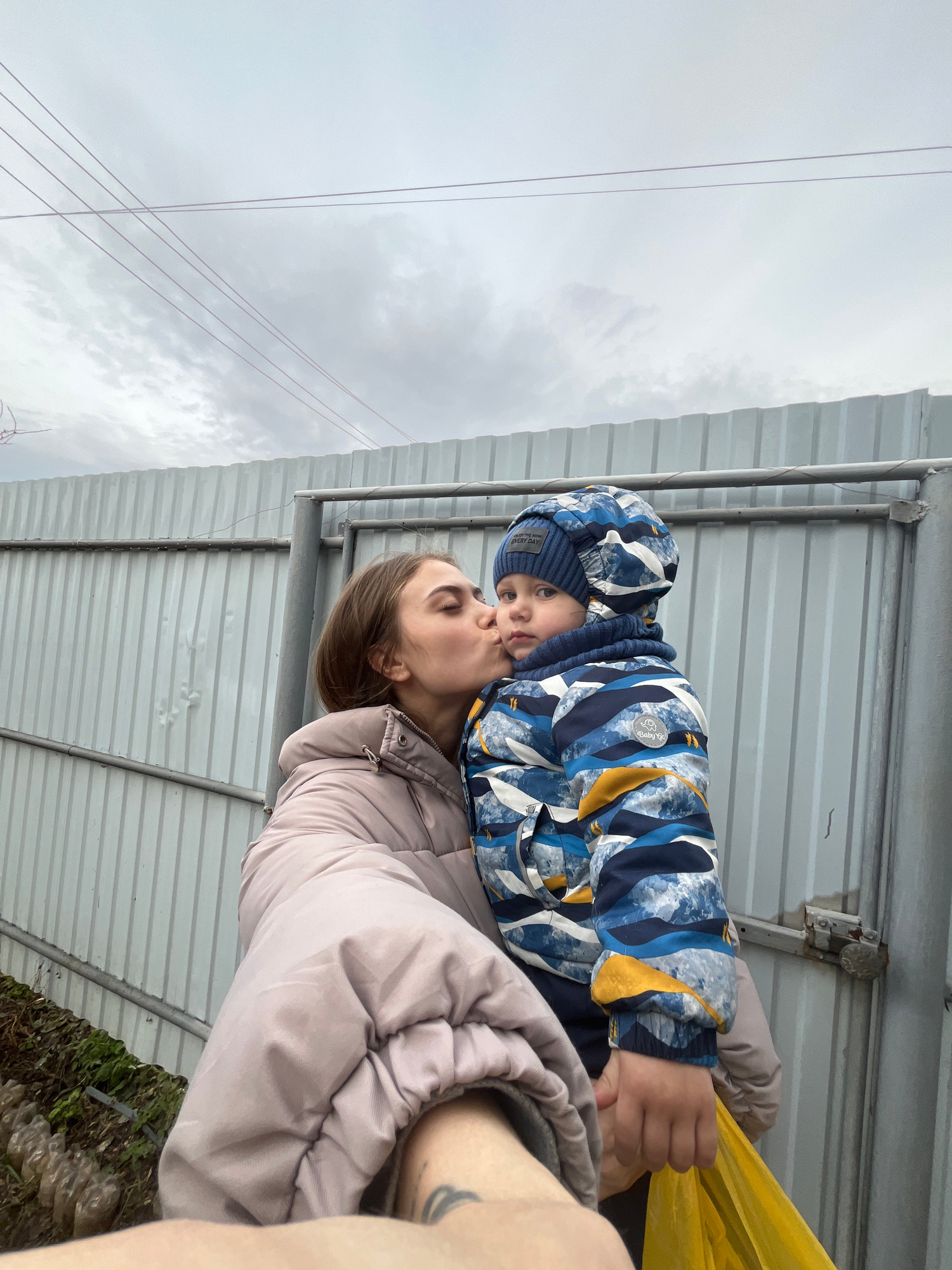 The image shows a young woman holding a young child, presumably her son, in an embrace. The child is wearing a blue and yellow patterned snowsuit with a matching hat. The woman is wearing a light pink…read more