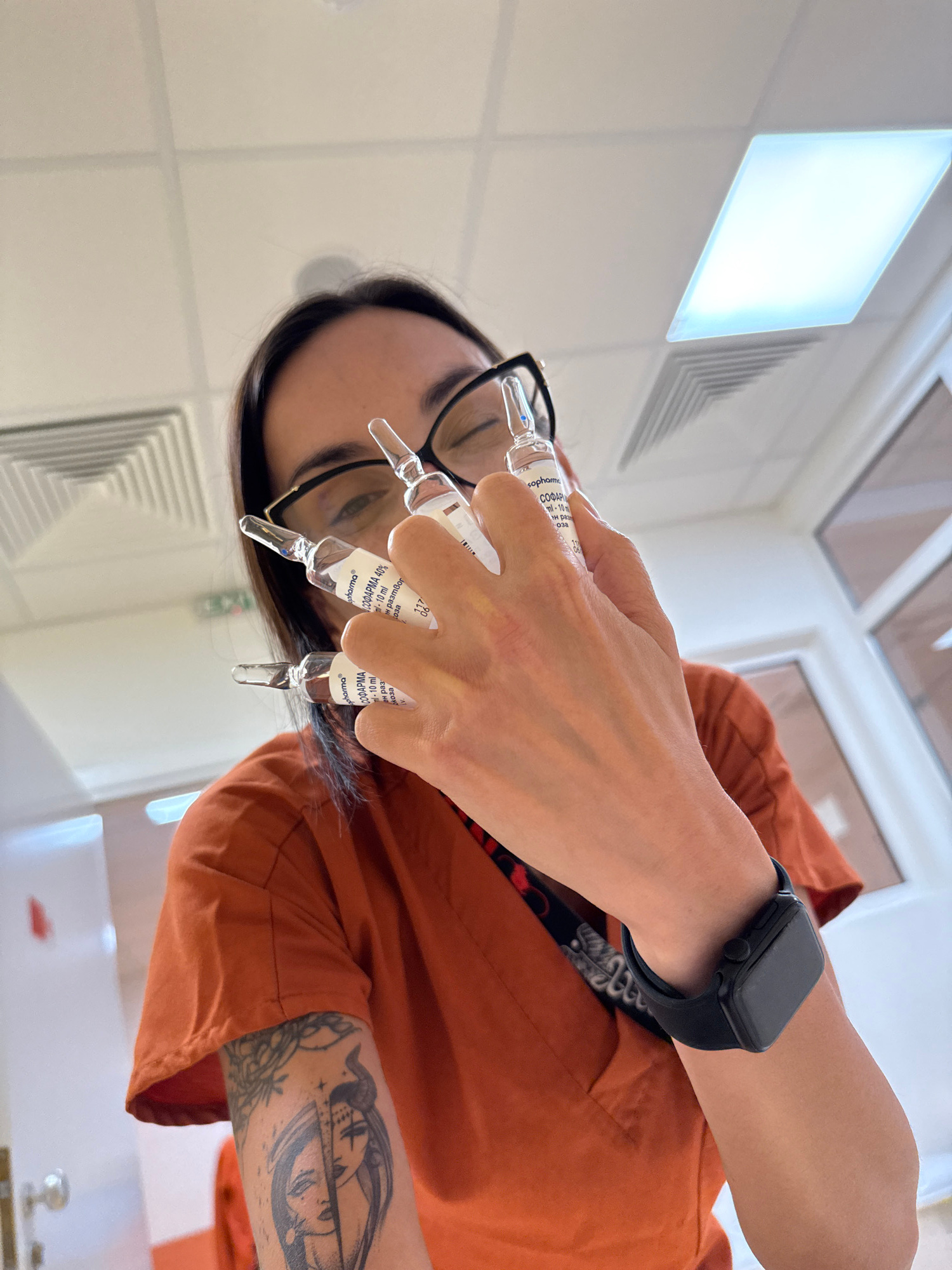 A person wearing glasses and an orange shirt holds three ampoules of Sopharma 40% glucose solution in a bathroom setting. The person has a black smartwatch on their left wrist and a tattoo on their leβ¦read more