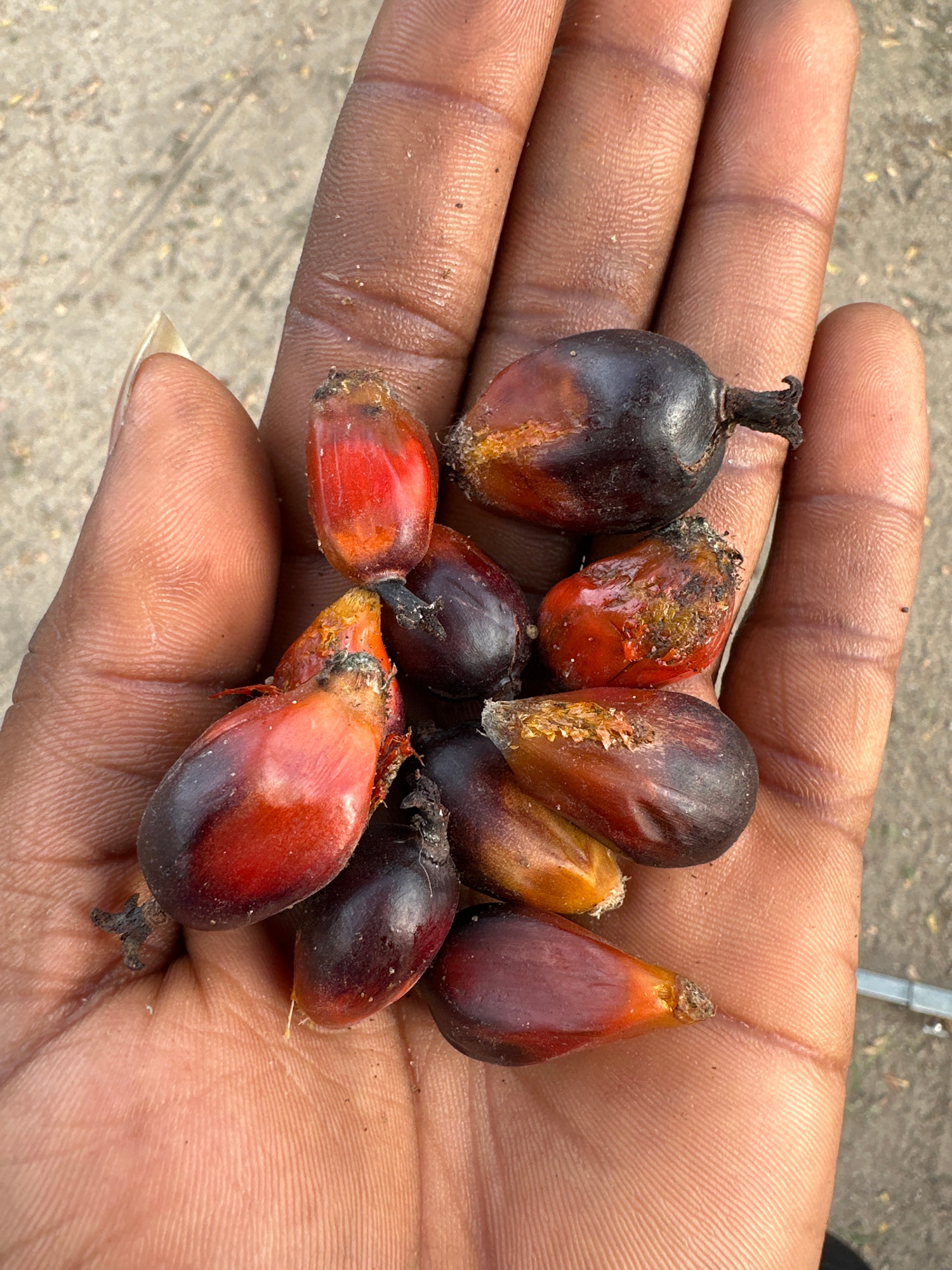 A hand holds a small pile of eight dark red and brown palm fruit. The fruit are oblong or pear-shaped. The hand is dark-skinned, and the fingernail of the index finger is visible. The background is a…read more