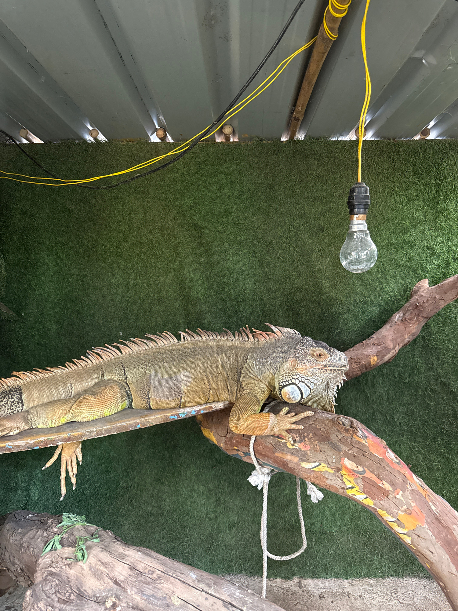In Nashik, India, an iguana clings to a painted tree branch in a habitat with artificial turf. The iguana, primarily gray and tan with blue accents on its side, is positioned vertically. Its head is fâŚread more