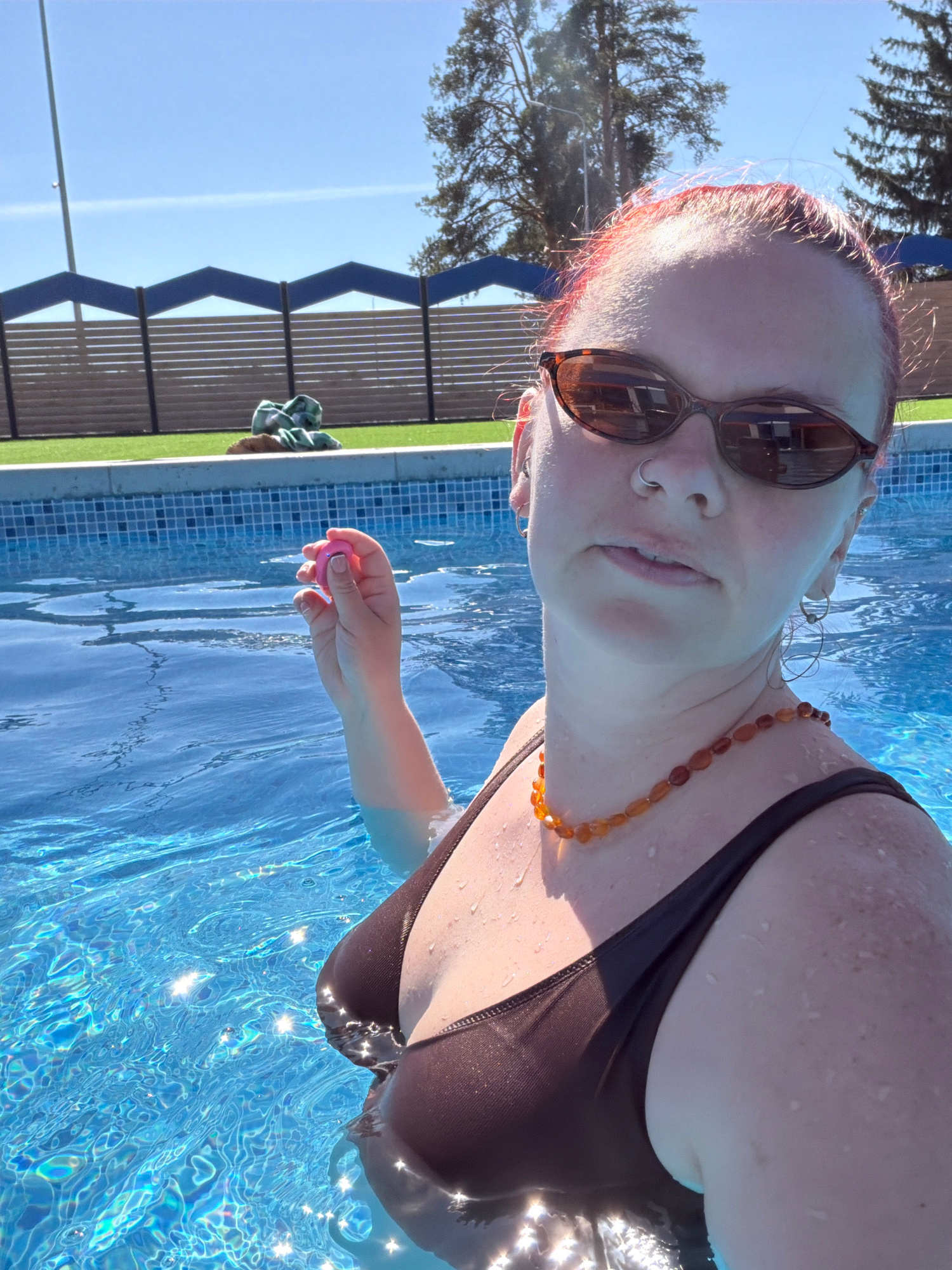 A woman is swimming in a pool. She is wearing sunglasses, a dark-colored swimsuit, and a beaded necklace. She has pink-tinted hair. She is holding a pink object in her right hand. The pool is surround…read more
