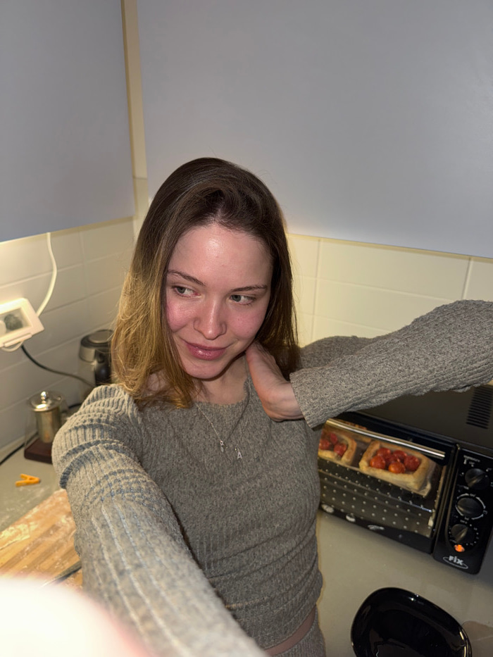 The image depicts a domestic kitchen scene in Tel-Aviv, Israel. A light-skinned female subject with medium-length brown hair occupies the foreground, extending her left arm towards the camera, indicat…read more