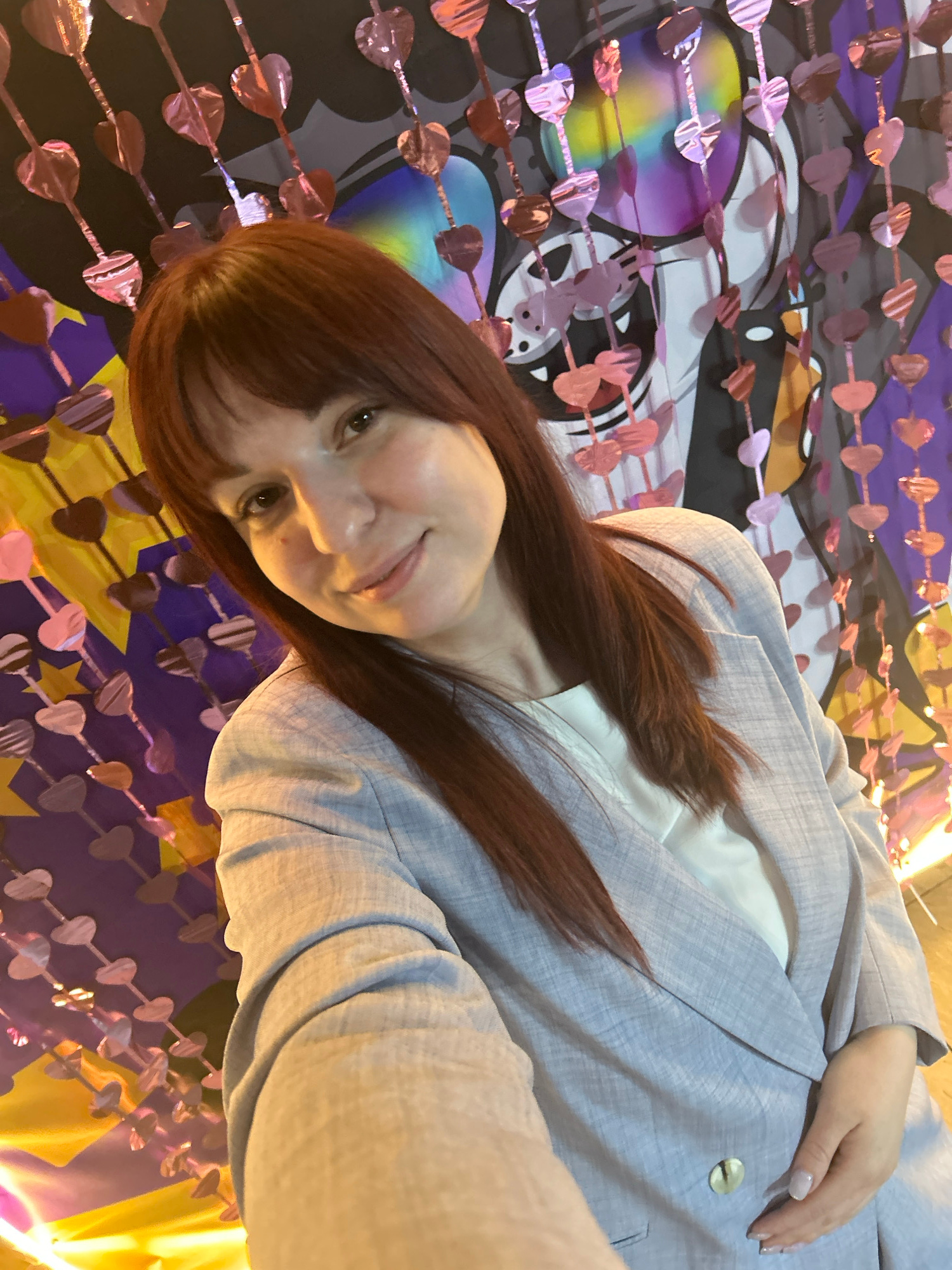 A woman with auburn hair is wearing a light blue blazer over a white shirt. She is positioned in front of a colorful backdrop featuring cartoonish designs and heart-shaped decorations. The picture appโ€ฆread more