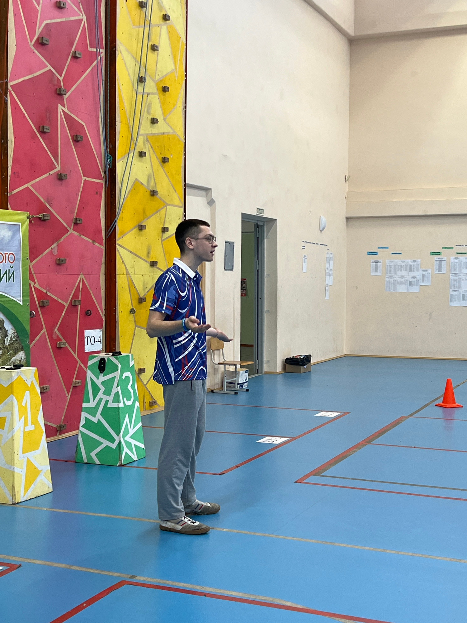 The image depicts a man standing in what appears to be an indoor sports facility, potentially a gym or climbing center in Berezniki, Russia. The walls are painted with climbing holds arranged on a red…read more