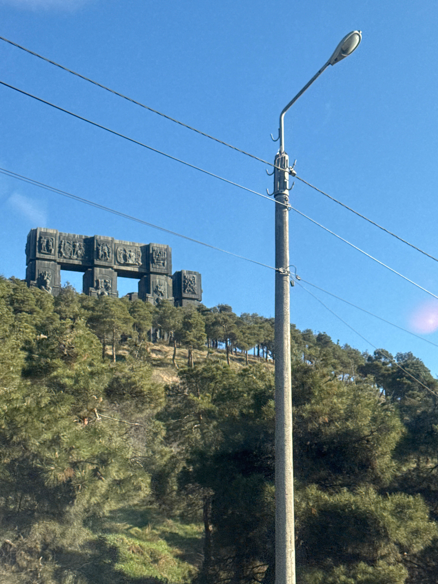 The image depicts a street scene in Tbilisi, Georgia, showing a lamppost extending horizontally across the frame against a clear blue sky. Power lines run parallel above the post. To the right, a larg…read more