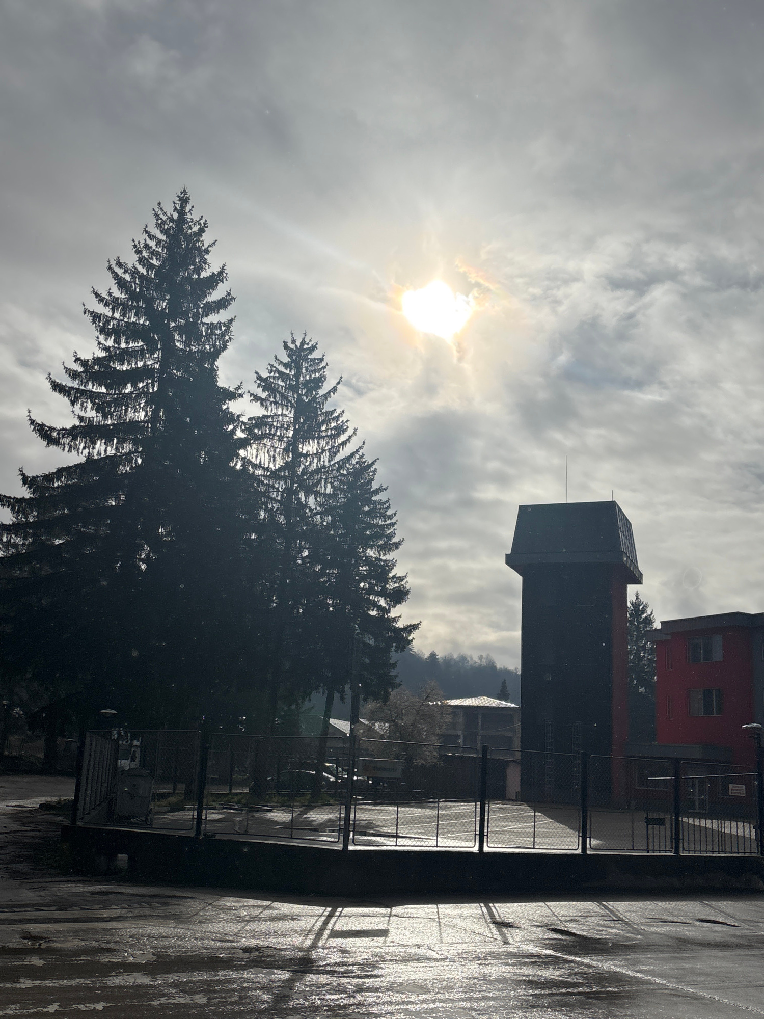 The image depicts a partially obscured cityscape in Troyan, Bulgaria, under a cloudy sky with the sun partially visible. In the foreground, two evergreen trees stand prominently, silhouetted against the bright sky. Adjacent to the trees, a fenced area runs along the edge of a building. The building is two-toned, with a red upper section and a dark-colored, tower-like structure extending upwards. In the background, hints of other buildings and possibly a distant mountain range can be seen through the haze. The foreground also shows a wet or possibly snow-covered surface reflecting light, suggesting recent precipitation. No people are visible in the scene. | Open Wire