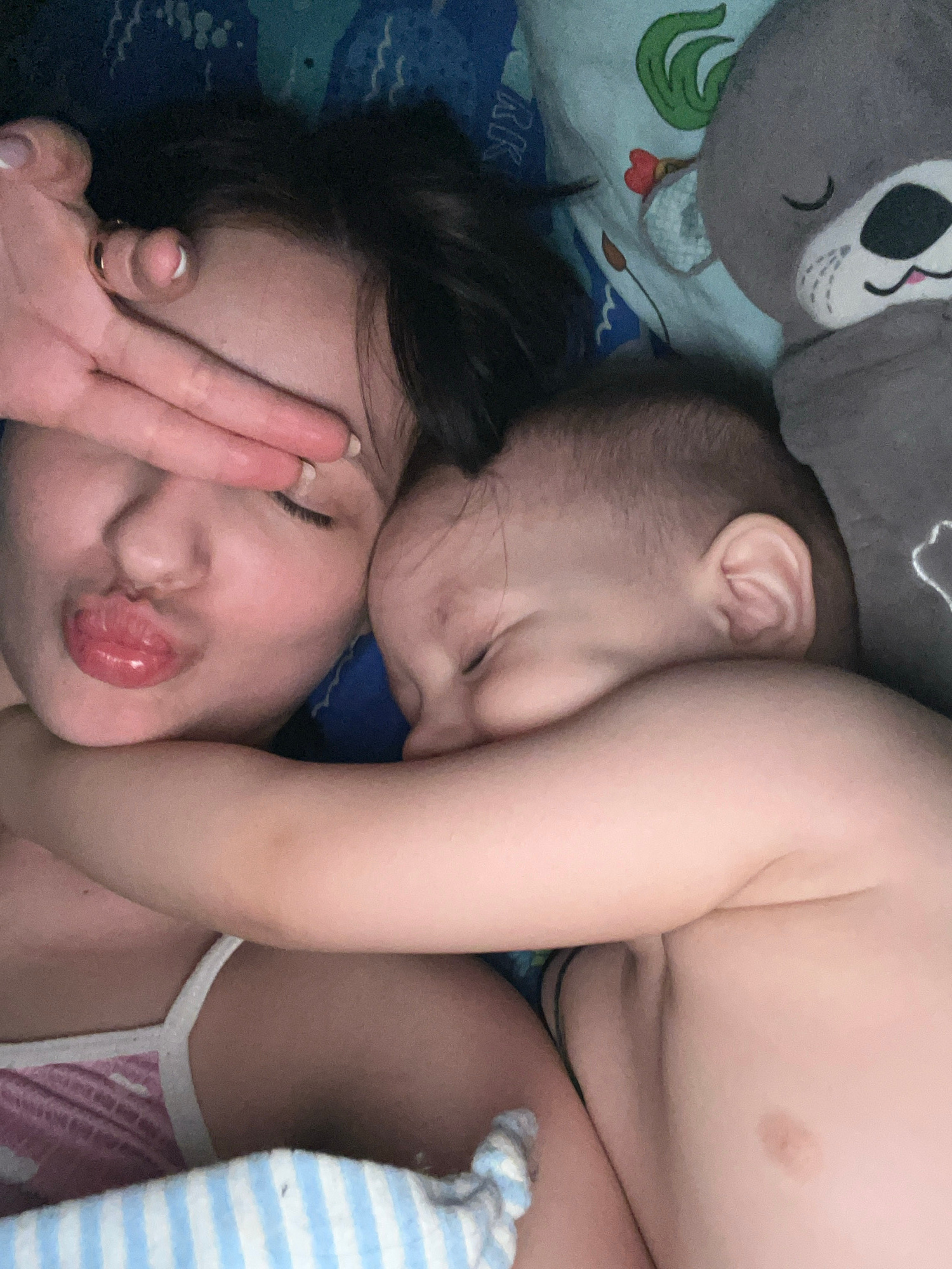 A woman and a baby are lying on a bed, presumably in a domestic setting. The woman is on her back, with her left hand covering part of her face. The baby is nestled on top of her, with their head near…read more
