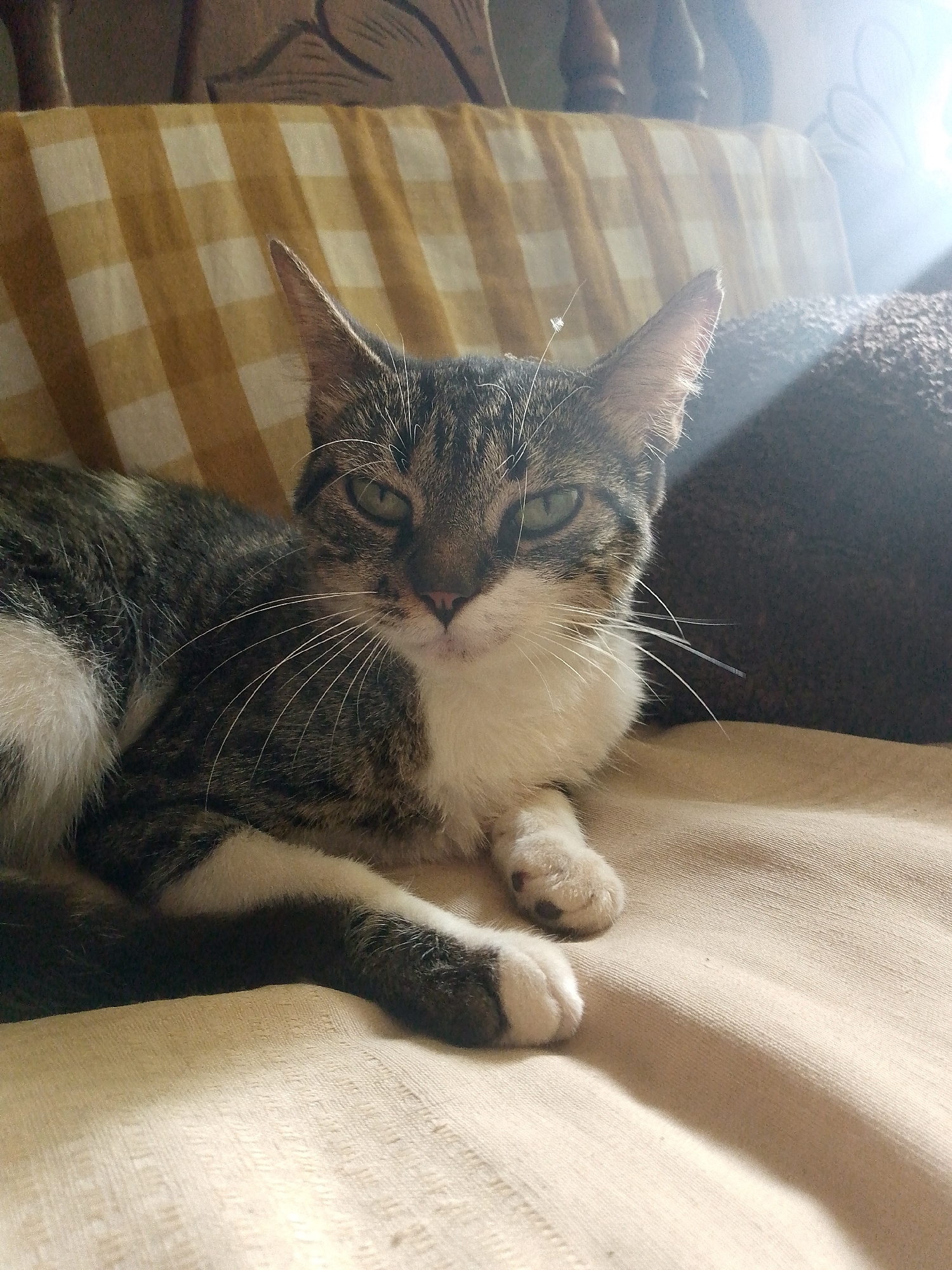 A domestic short-haired cat with tabby and white markings is lying on a beige couch. The cat has green eyes and is looking directly at the camera. Behind the cat is a yellow and white checkered patter…read more