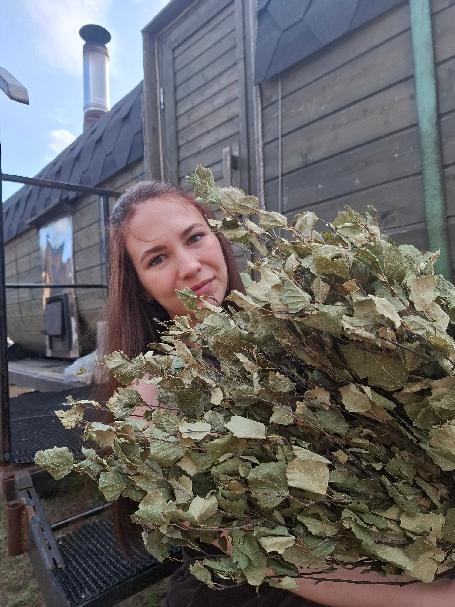 A woman is holding a birch broom in Chaikovsky, Russia. The image is taken from a low angle, looking up at the woman. She has long brown hair and is smiling slightly. The birch broom is large and cove…read more