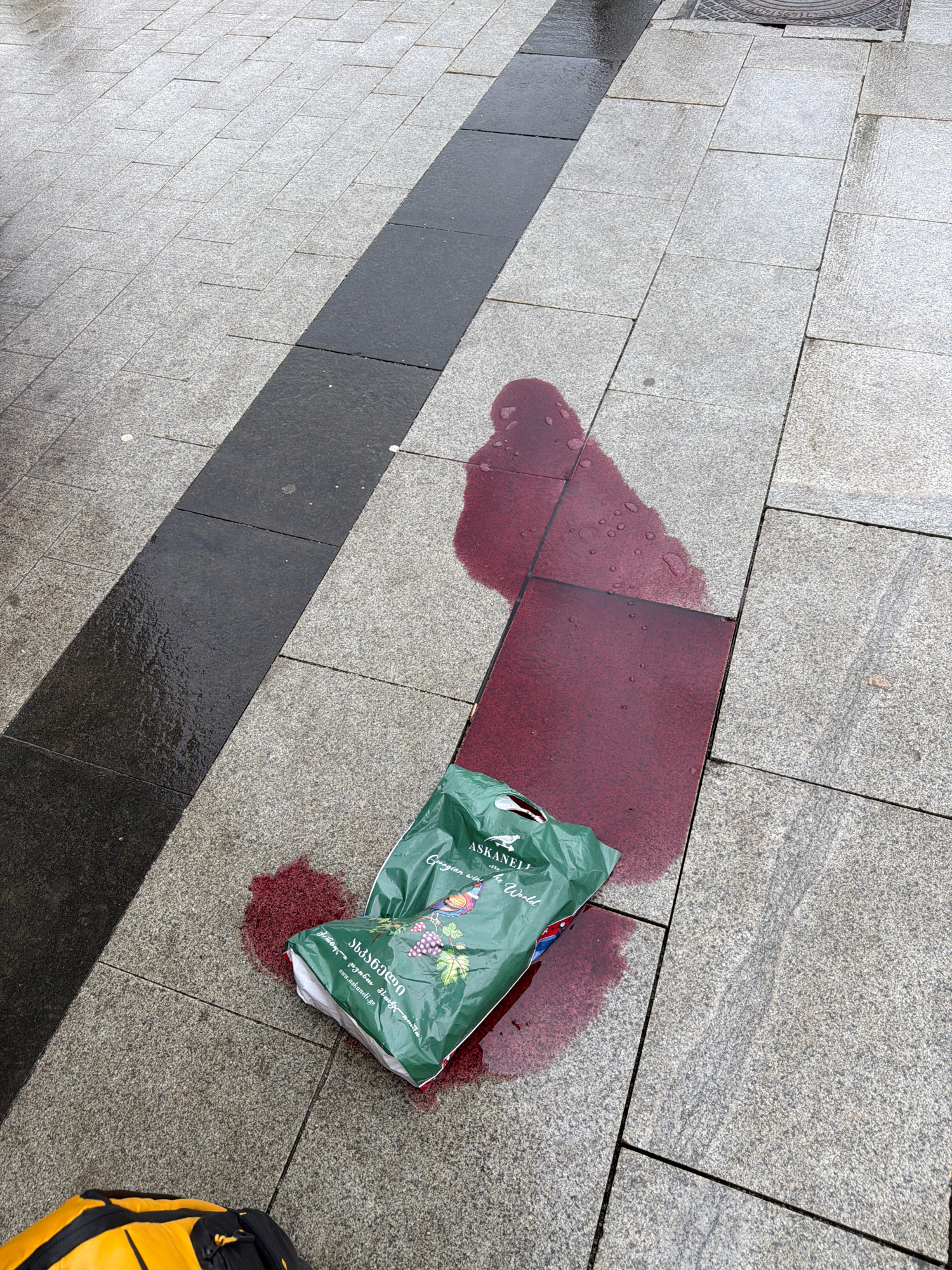 A spilled bag of red wine sits on a pedestrian walkway made of gray stone slabs. The spill has stained a red tile. The bag is green and appears to be from a shop. A black stripe runs through the stoneβ¦read more