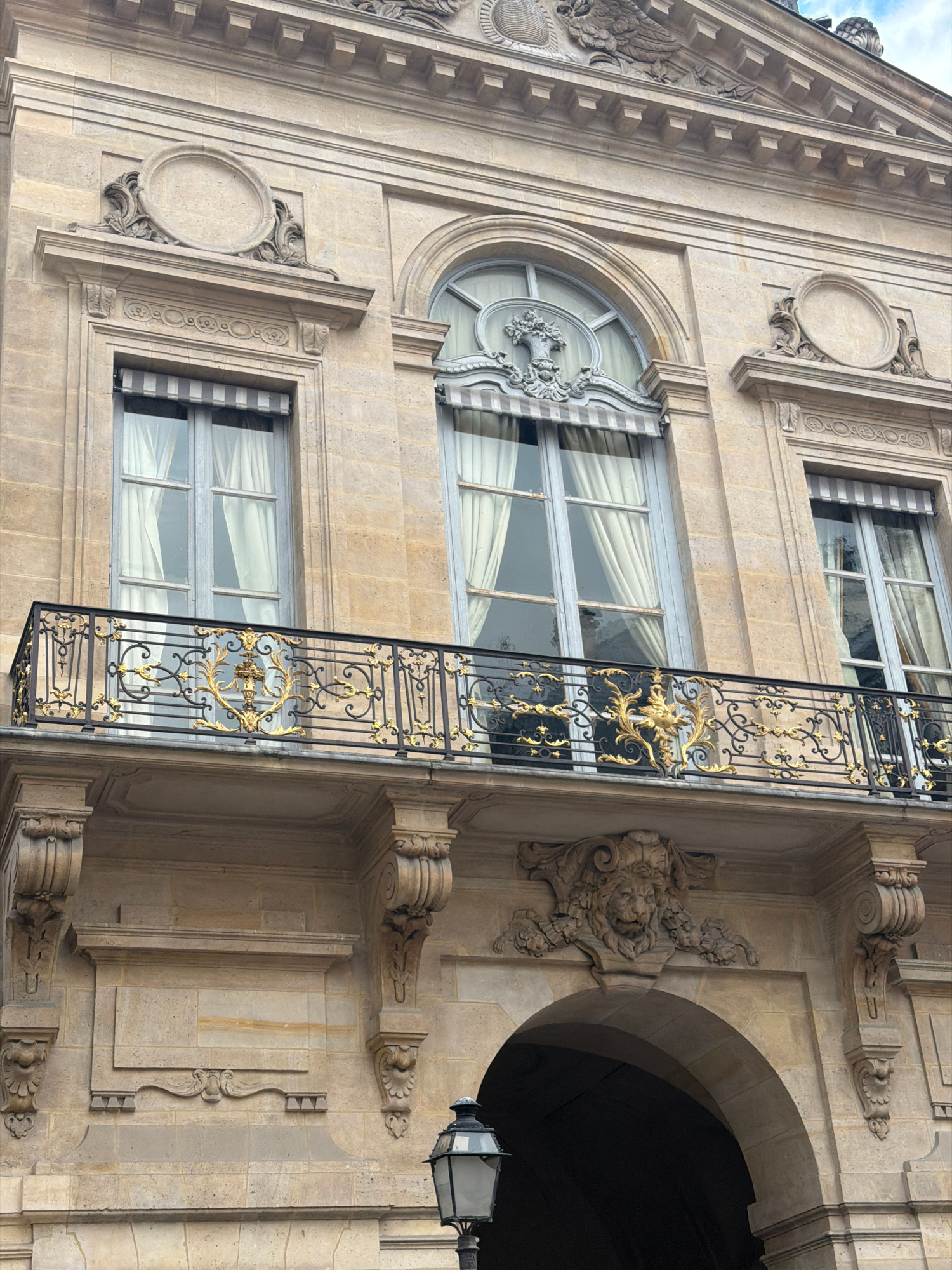 A close-up, low-angle view captures a segment of an ornate building facade in Paris, France, exhibiting classical architectural grandeur. The structure is crafted from light-colored stone, adorned wit…read more