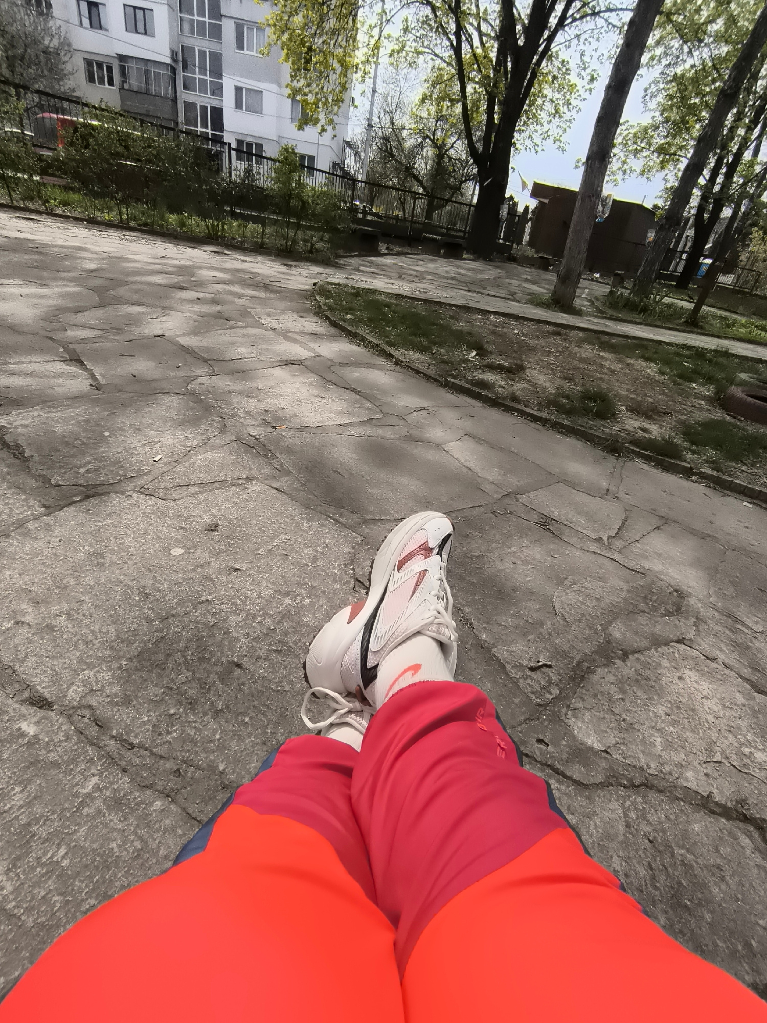 A first-person perspective image shows someone sitting on a concrete surface in an urban park. The individual is wearing a pair of white Nike sneakers with a red swoosh, white socks with a red Nike sw…read more