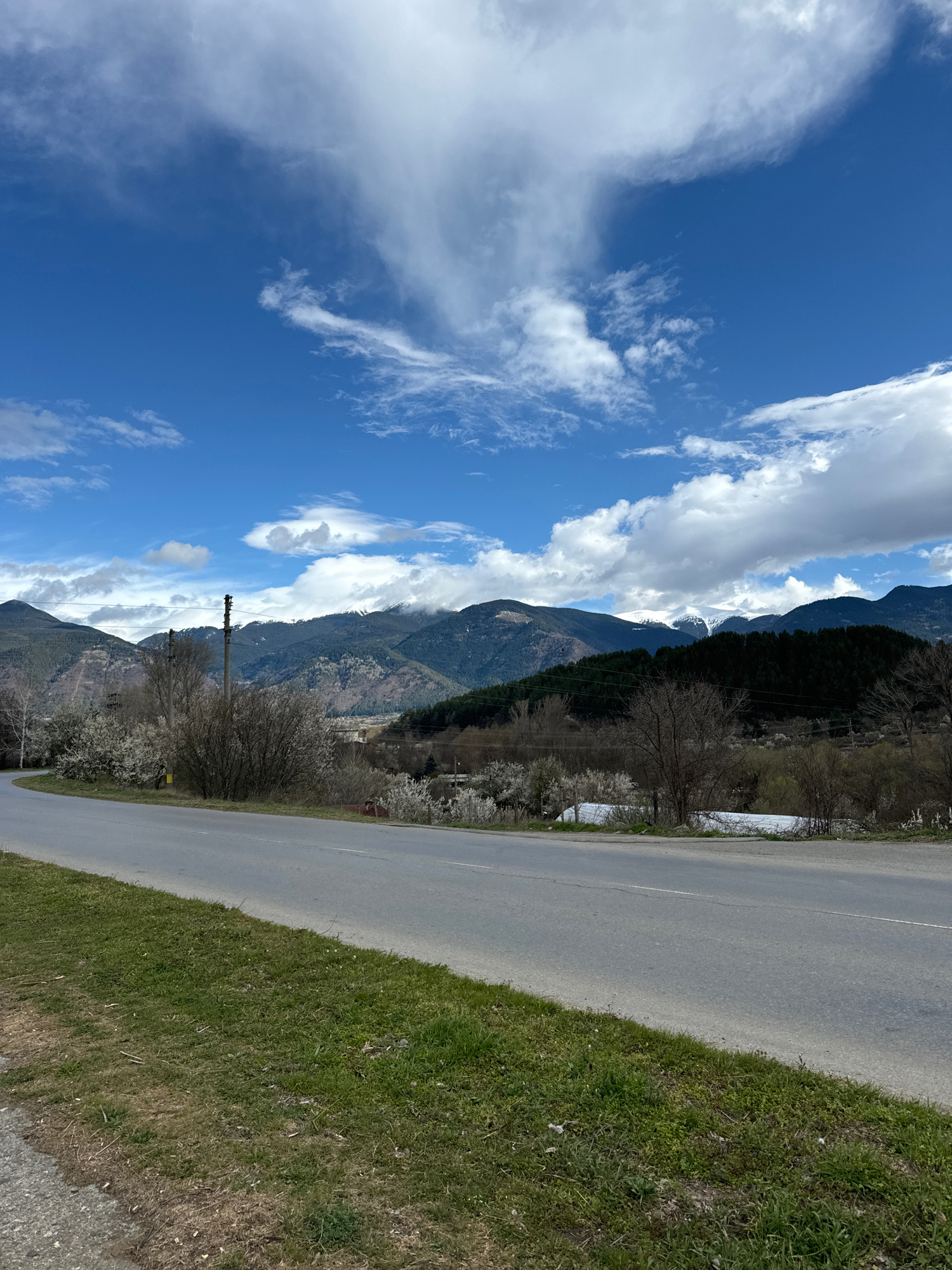 The image depicts a view of a road in Samoranovo, Bulgaria, with mountains in the background. The sky is blue with white clouds. A road runs along the right side of the frame with grass to its right,…read more