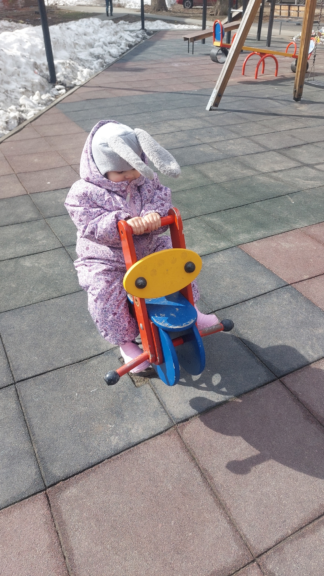 A small child wearing a hooded jacket and bunny ears is seated on a playground spring rider shaped like an airplane. The rider is constructed of red, yellow, and blue painted wood with black hand grip…read more