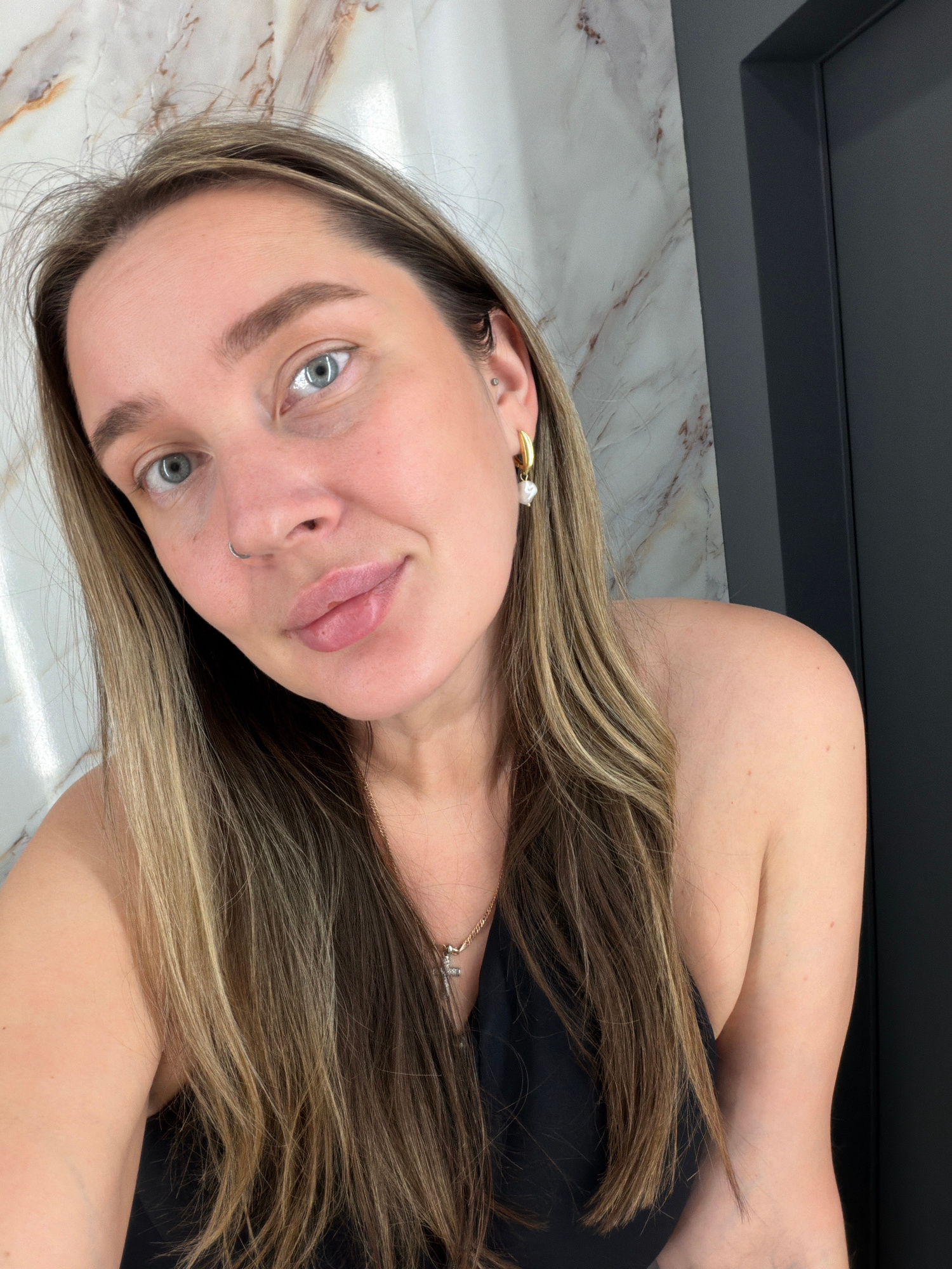A woman with long blonde hair, blue eyes, and fair skin is pictured from a close-up, slightly angled perspective. She has a piercing in her left nostril and is wearing earrings. She appears to be indo…read more