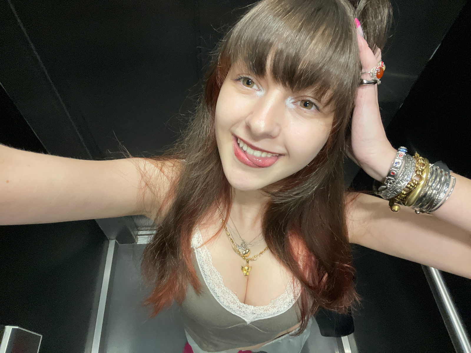 A woman lies on a dark surface, possibly a bench or seat, oriented at an angle to the camera. She wears a low-cut, light green top with white lace trim and multiple necklaces, including one with a gold pendant. Her brown hair has reddish highlights, and she has fair skin, wearing makeup. She is smiling slightly with her tongue visible. A stack of bracelets adorns her left wrist. The background consists of a light gray wall with a metallic accent and a dark, likely black surface. The location is Raanana, Israel, but the photo does not provide information to be more specific within the city. The image is a selfie. | Open Wire