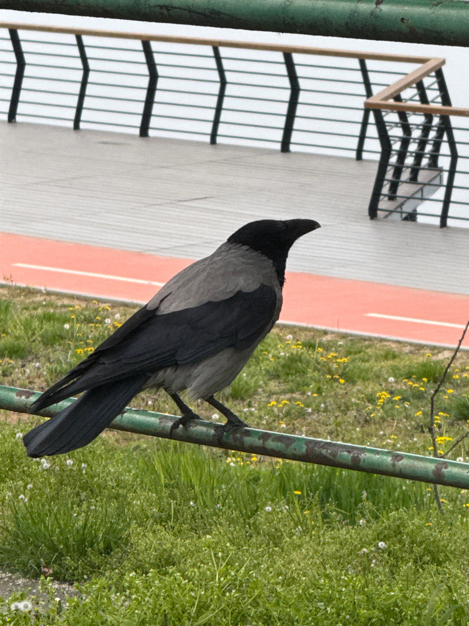 A hooded crow perches on a green metal rail near a sidewalk and grassy area with yellow flowers. A structure with vertical bars and a red stripe are visible in the background.