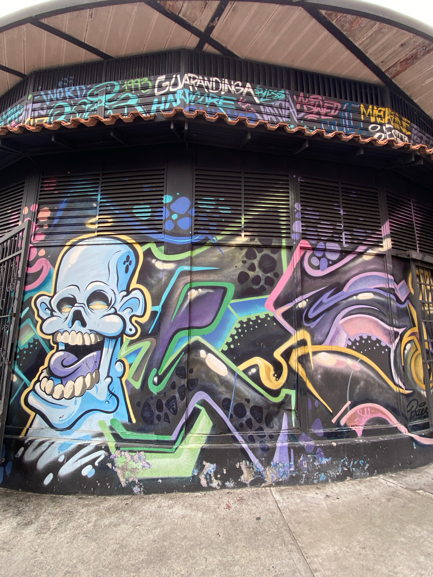 The image displays a vibrant section of a building's exterior adorned with extensive graffiti art, likely in an urban setting during daytime. The artwork covers black metal panels and vertical grates,…read more