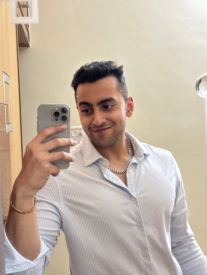 A man wearing a striped dress shirt and a silver chain necklace is taking a selfie in a mirror. He's holding a gray phone in his left hand, a gold bracelet adorns his wrist. The background is a neutra…read more