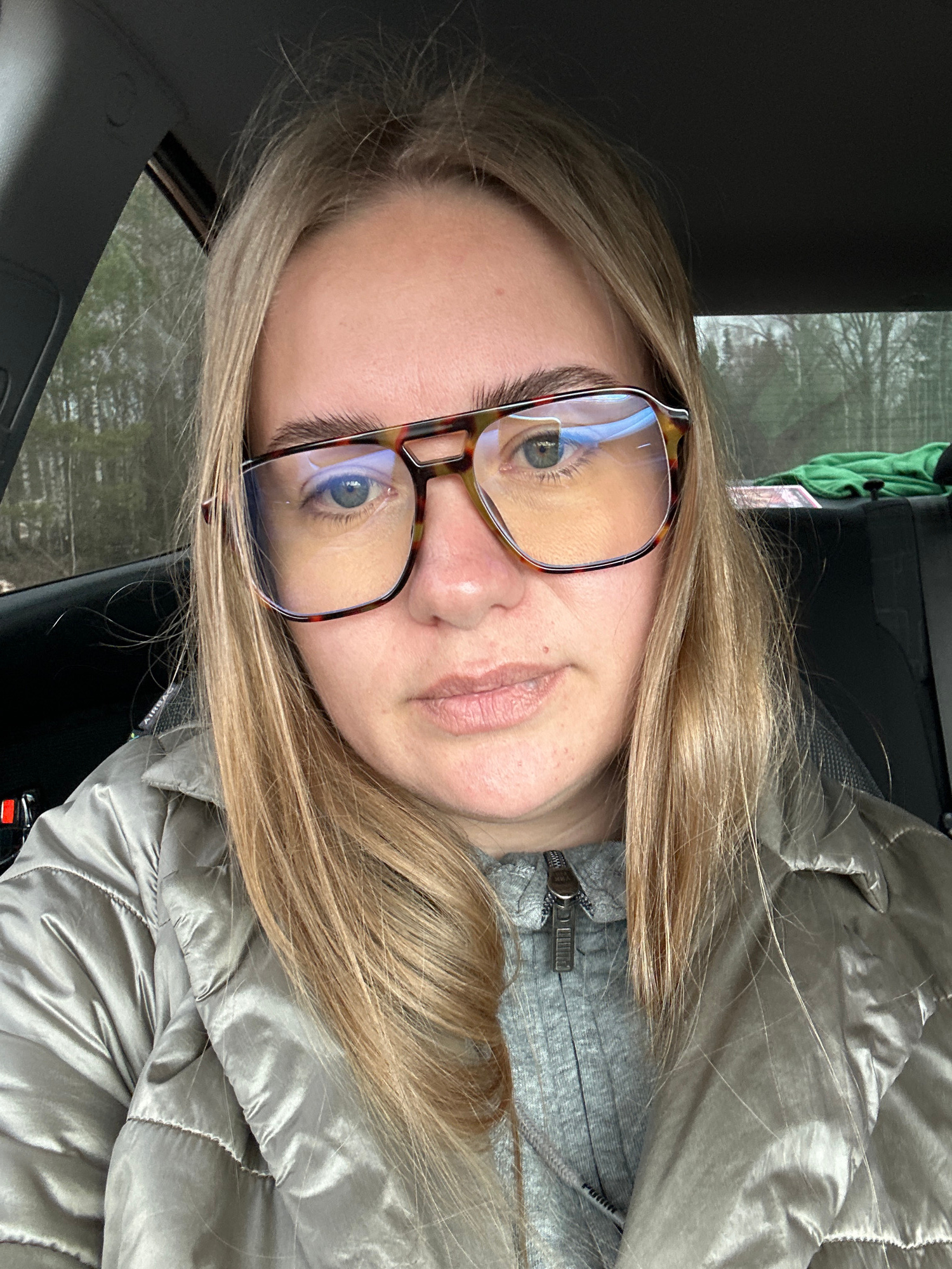 A blonde-haired person wearing glasses is positioned in what appears to be the driver's seat of a vehicle. The person is wearing a gray jacket. The background shows trees through the car window. The lā¦read more