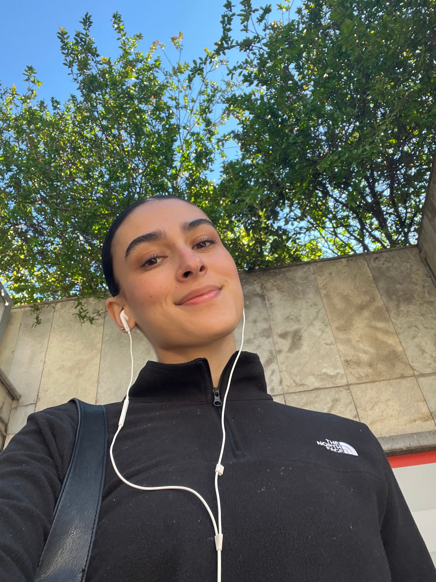 A person wearing a black North Face fleece and wired earphones is standing under a tree. The photo is taken from a low angle. The background includes blue sky, green leaves, and a beige tiled wall. Th…read more