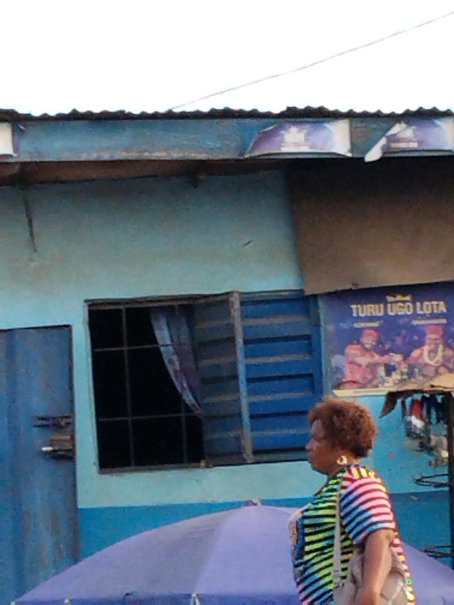 A medium shot shows a woman with short brown hair, wearing a striped shirt and carrying a bag, standing on a city street in Aba, Nigeria. She is standing in front of a blue building with a window. A p…read more