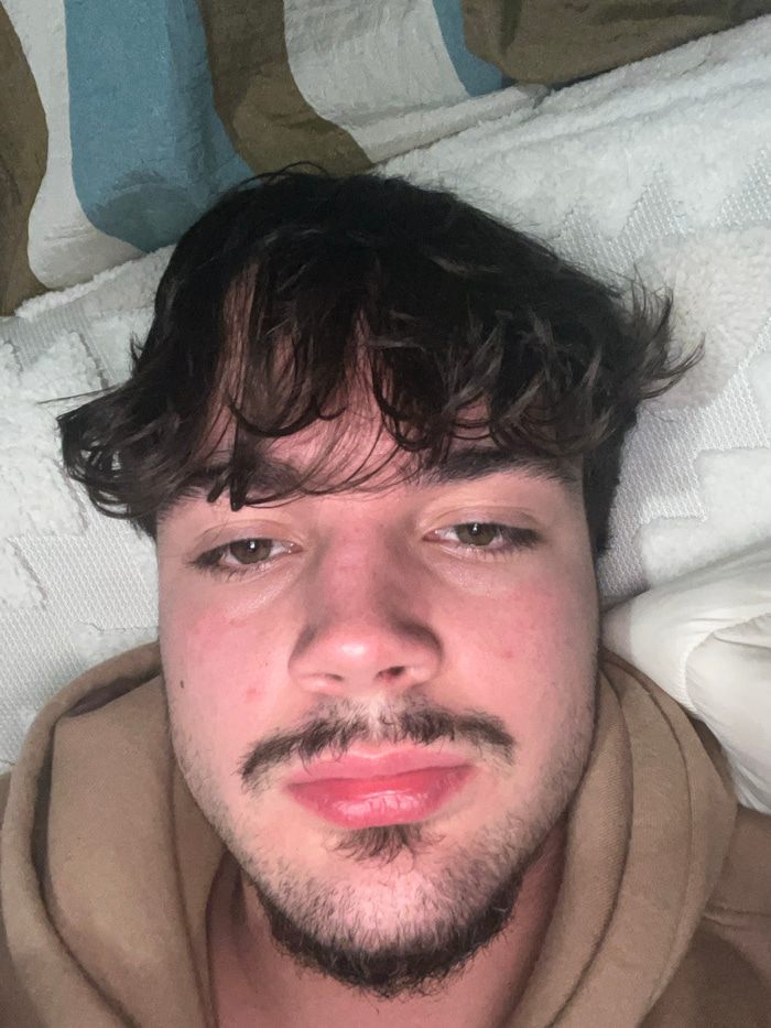 A young man with dark, wavy hair and a short beard lies on his side, facing the camera. He has light skin and green eyes. He wears a tan hooded sweatshirt. The background includes a white pillow and a…read more