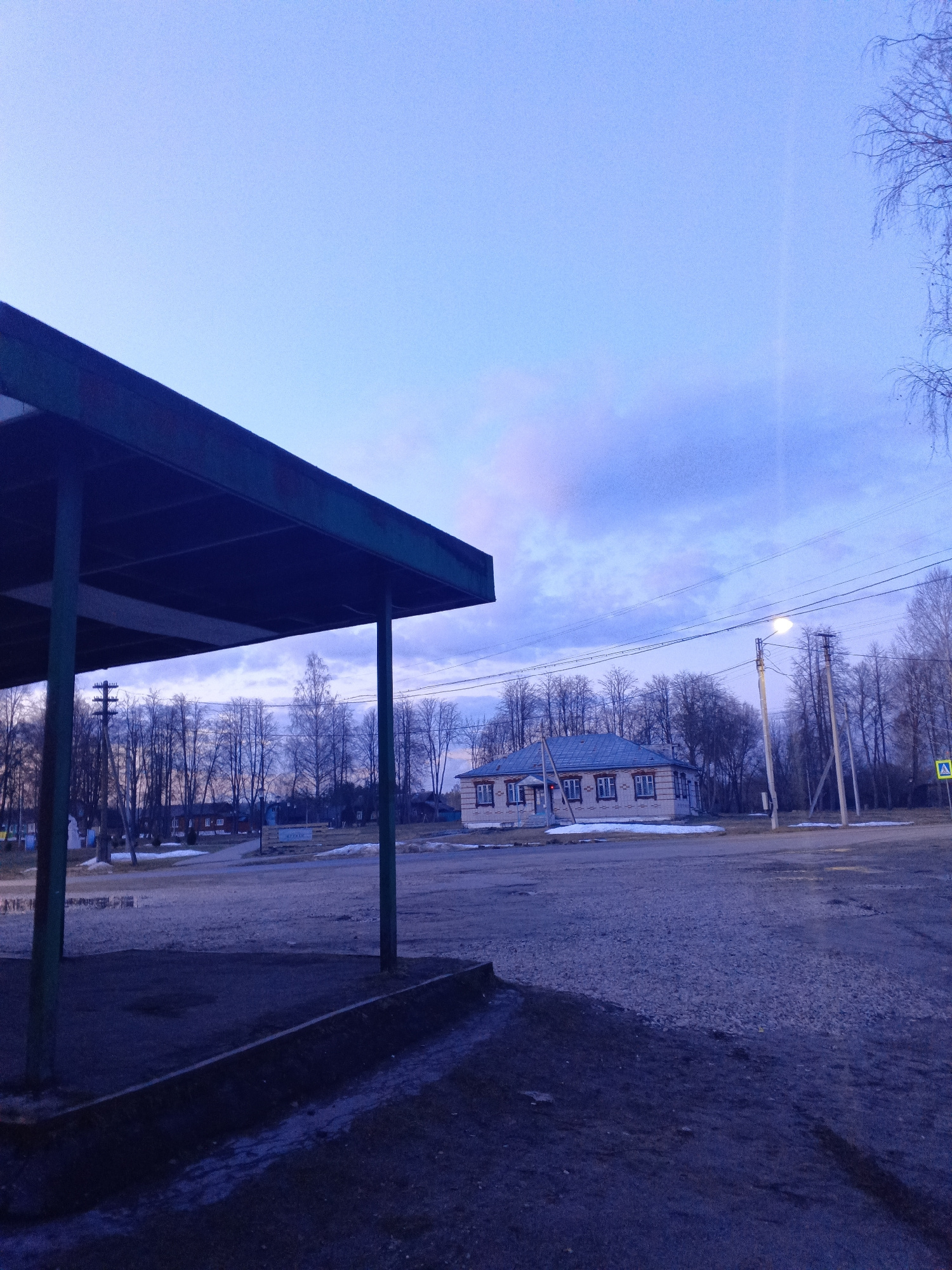 The image depicts a street scene in Красный Маяк, Russia. A bus shelter stands prominently in the foreground. Across the street, a single-story building with a blue roof is visible. Utility poles line…read more