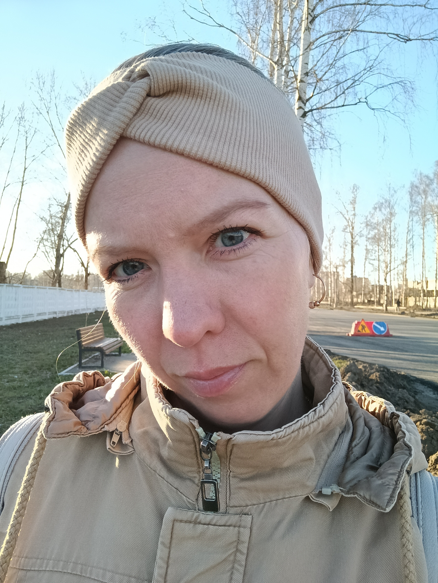 A medium shot captures a woman in Chaikovsky, Russia. She has fair skin, blue eyes, and wears a beige, twisted knit headband and a matching tan hooded jacket. The jacket is partially zipped up and fea…read more