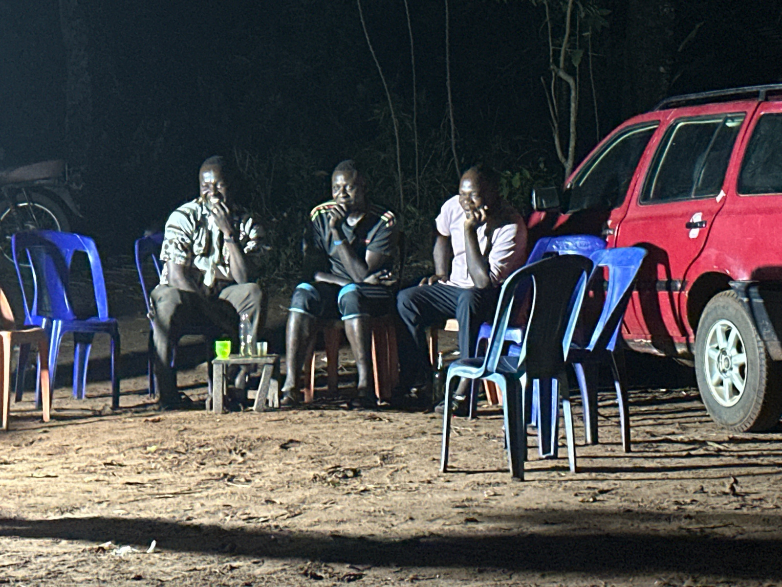 Three men are seated on chairs in an outdoor setting at night. They are arranged in a row, with two plastic blue chairs in front of the rightmost man. A small wooden table with glasses on it sits betw…read more