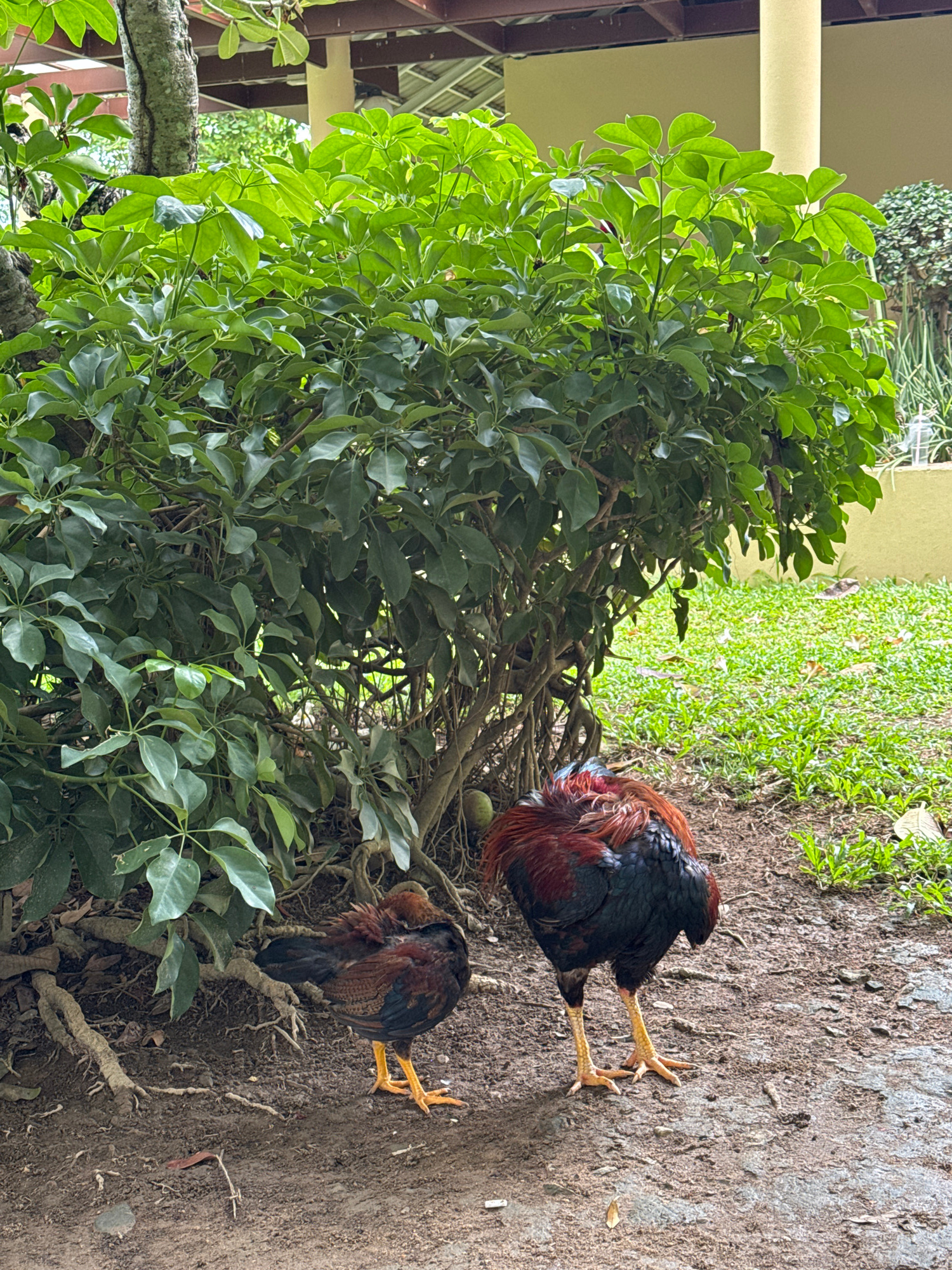 The image depicts two chickens in an outdoor environment. The chickens are situated on the ground near a large green shrub. The ground appears to be a combination of dirt and some sparse vegetation. T…read more