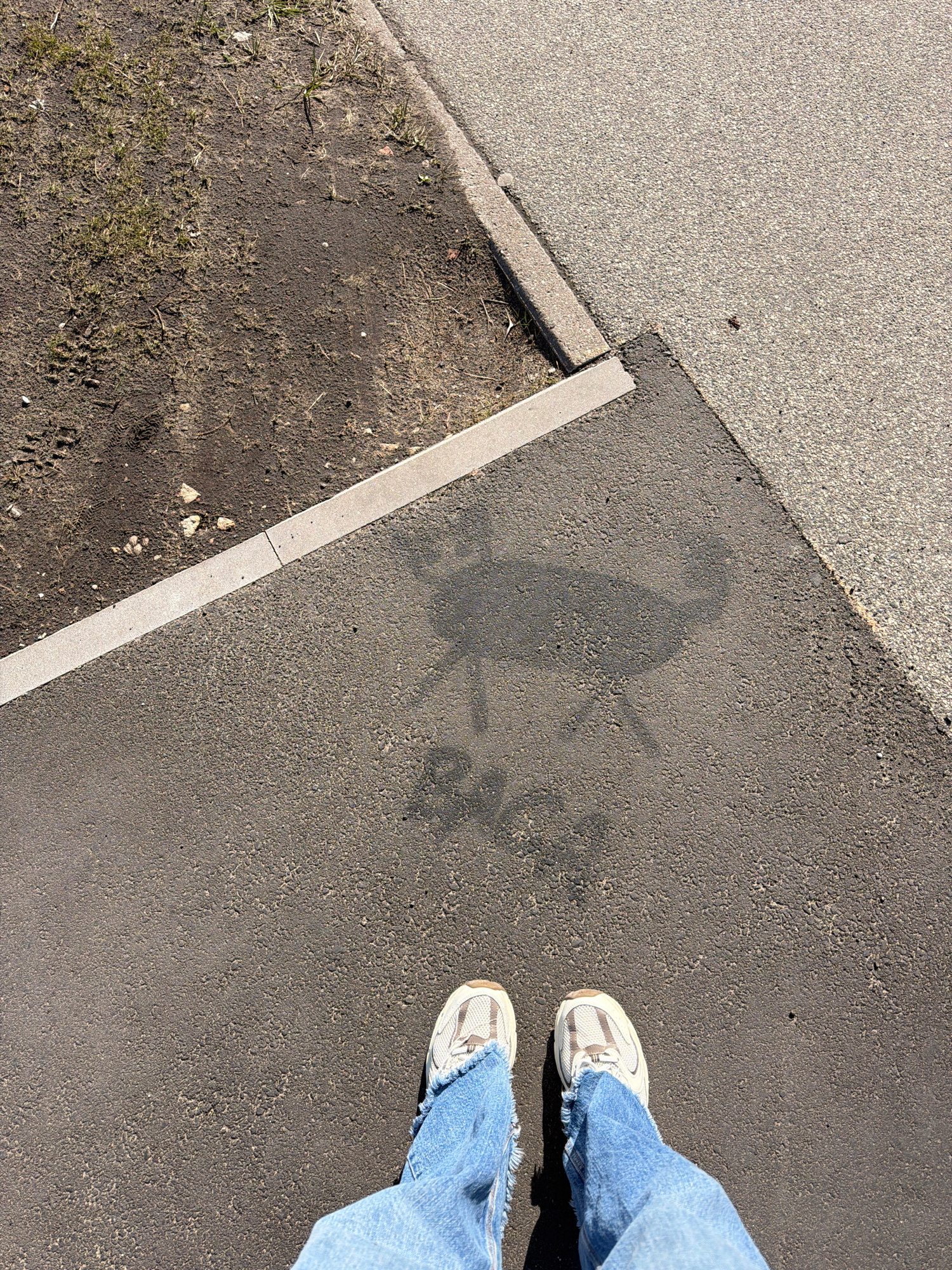 The image shows a section of pavement and curb in an outdoor setting. A portion of a sidewalk is visible on the upper left, transitioning to a paved street surface. A section of soil and sparse grass…read more