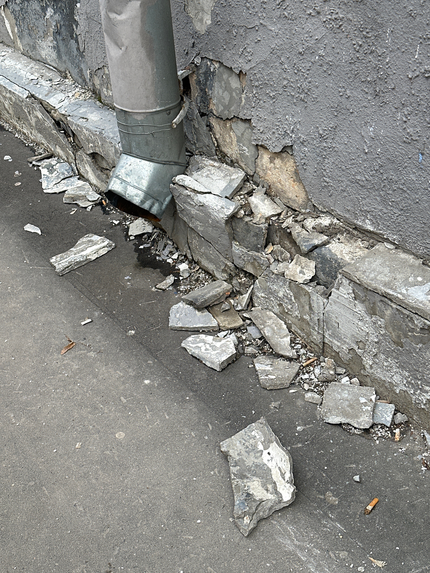 The image shows a damaged sidewalk, with a metal pipe running along the edge. The sidewalk is broken and cracked, with pieces of concrete scattered around. There is a cigarette butt on the sidewalk. I…read more