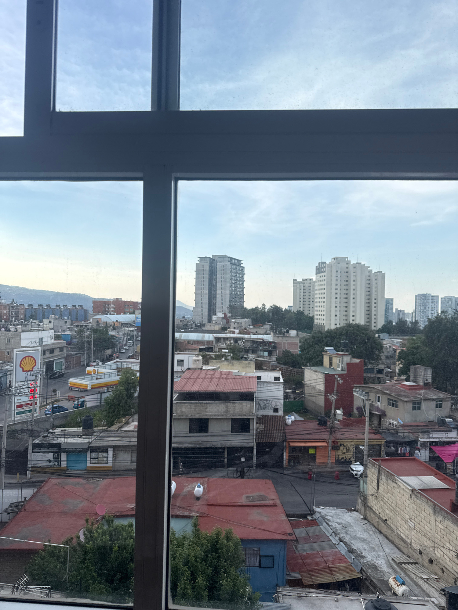 The image captures an elevated view of Jesús del Monte, Mexico, framed by a window. In the distance are taller buildings, possibly apartments or offices, and a mountainous region that gives a sense of…read more