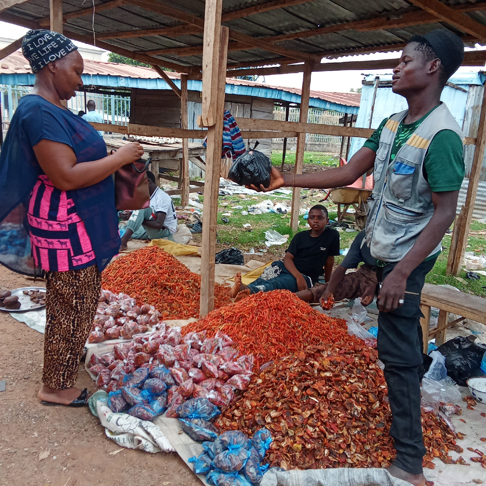 The image depicts a street market scene in Akwanga, Nigeria. A woman in a patterned skirt, pink striped top, and head covering is looking into her purse while standing at a stall. A man wearing a vest…read more