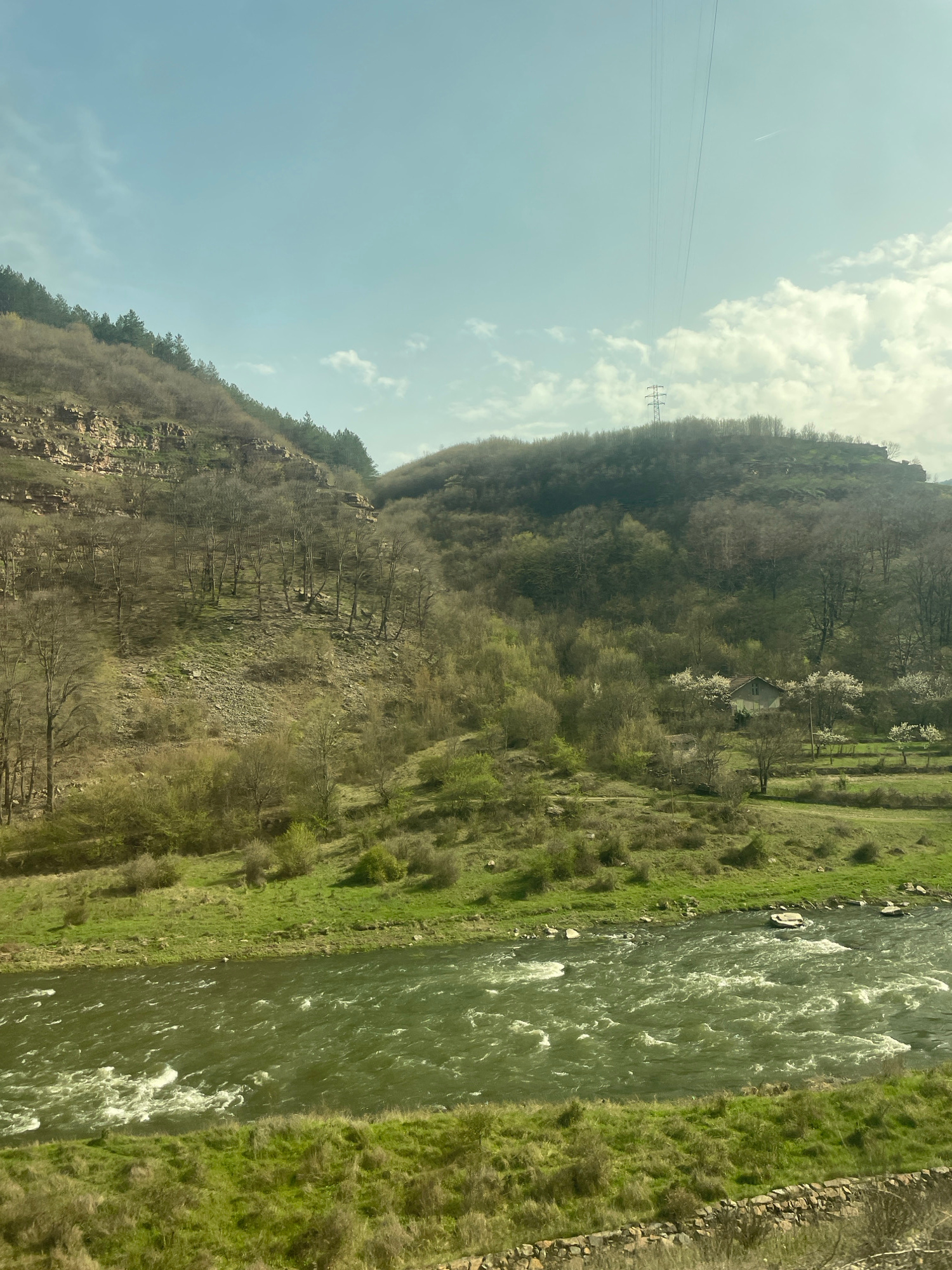 A slightly tilted, medium shot shows the Iskar River running through a rural scene near Tserovo, Bulgaria. The river dominates the right side of the image, its surface churning with white water rapids…read more