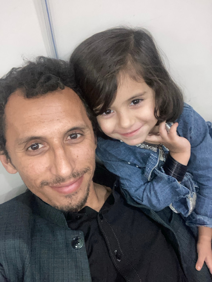 An adult male and a young female child are depicted in a close-up portrait against a plain, light-colored interior wall, specified as Quetta City Tehsil, Pakistan. The male, positioned on the left and…read more