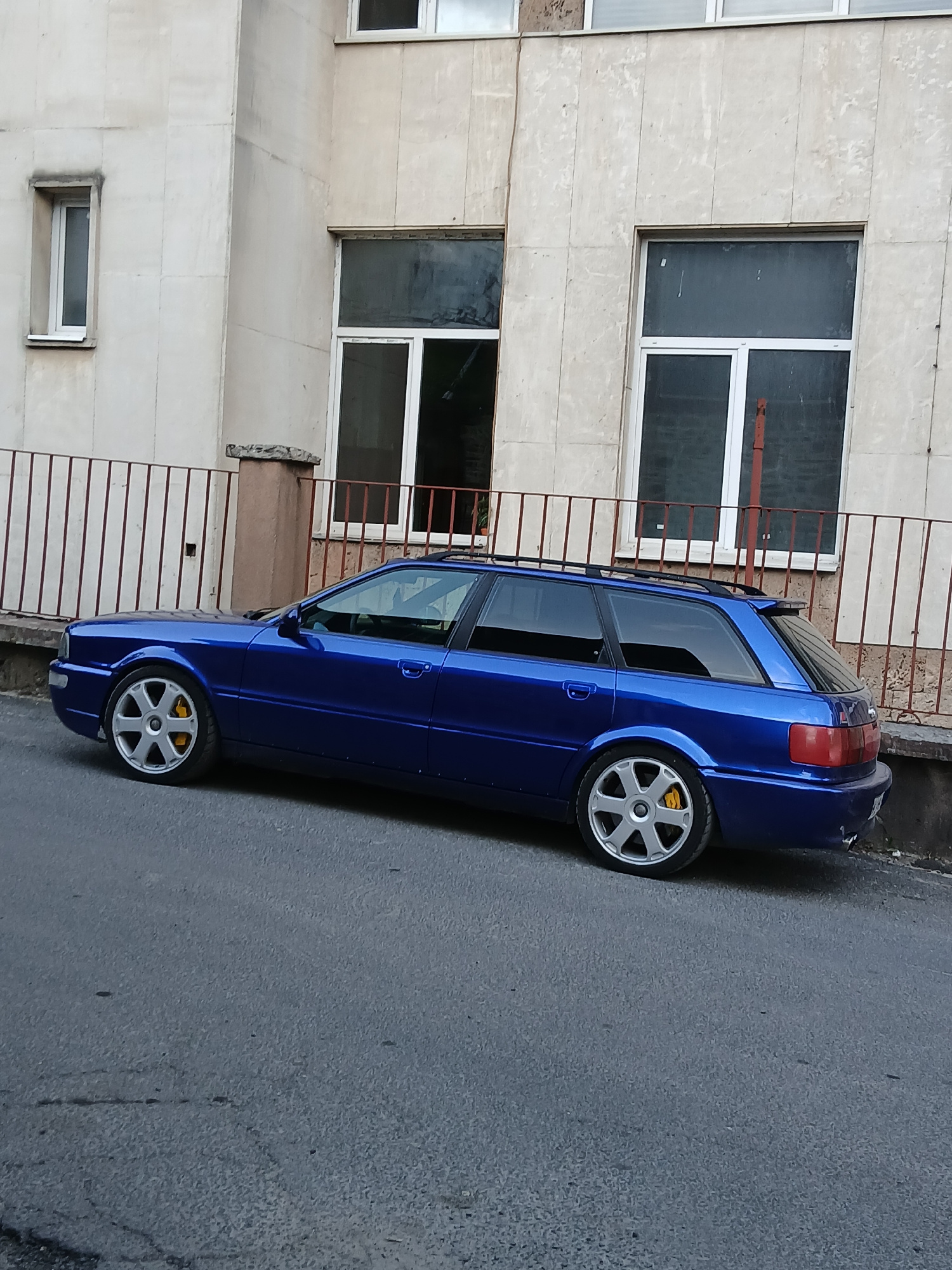 A blue Audi station wagon with roof racks and aftermarket silver rims with yellow brake calipers is parked on an asphalt road next to a multi-story building with white facade. The building has severalβ¦read more
