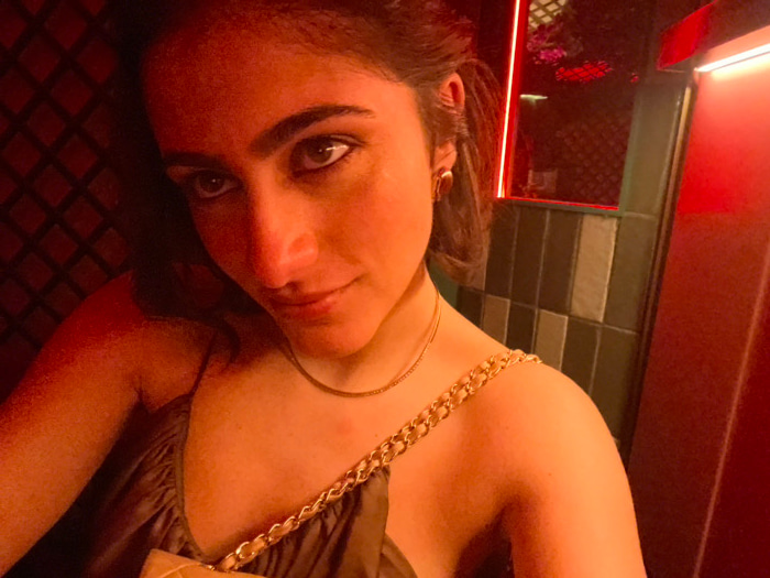 A medium-close-up selfie captures a young adult female from the chest up, positioned slightly off-center to the left. She has dark hair, brown eyes, and a neutral expression, looking directly at the c…read more