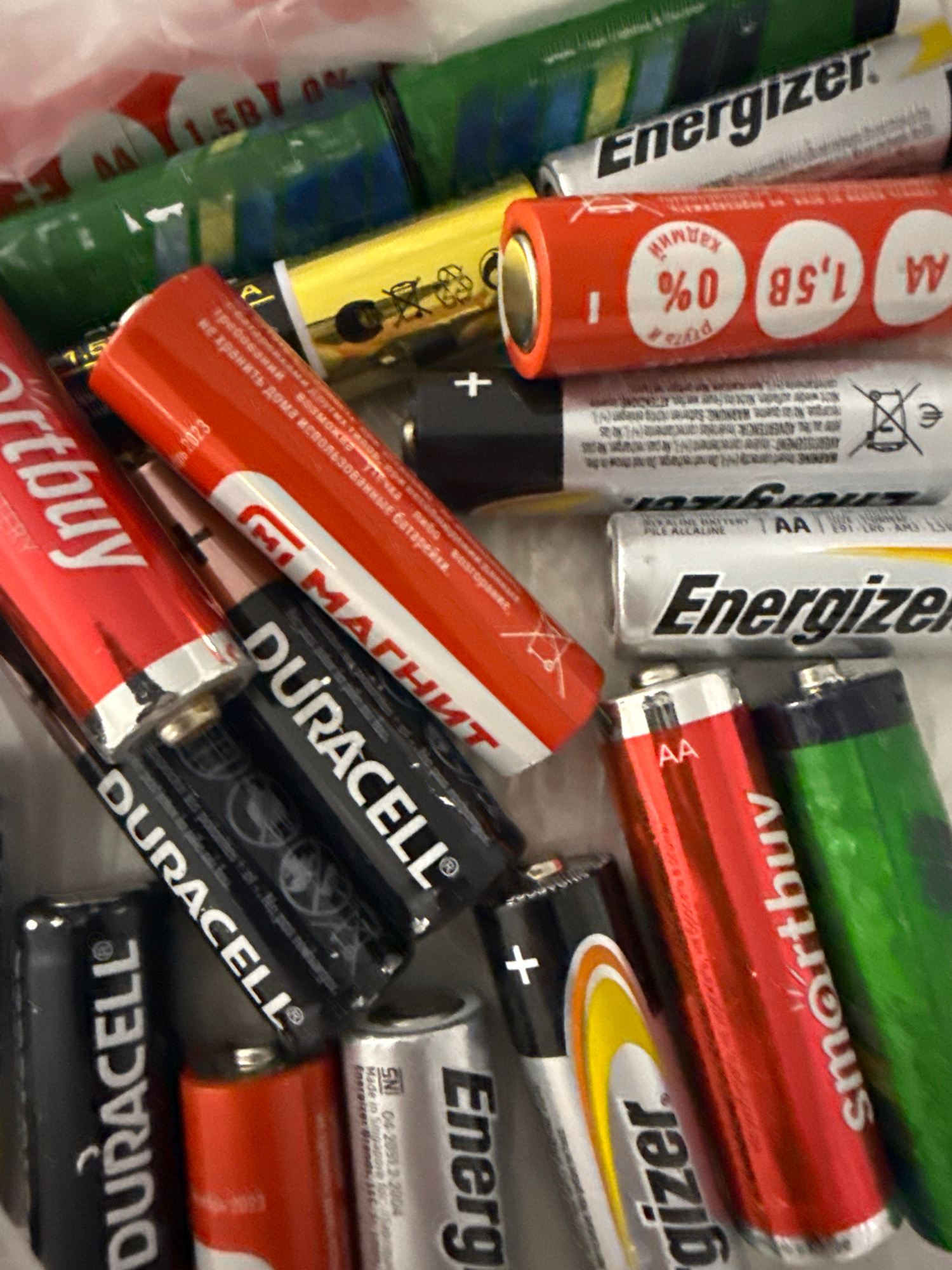 A close-up shot shows a collection of used batteries of various brands and types, likely discarded or awaiting recycling. Brands include Energizer, Duracell, Smartbuy, and other batteries labeled in R…read more