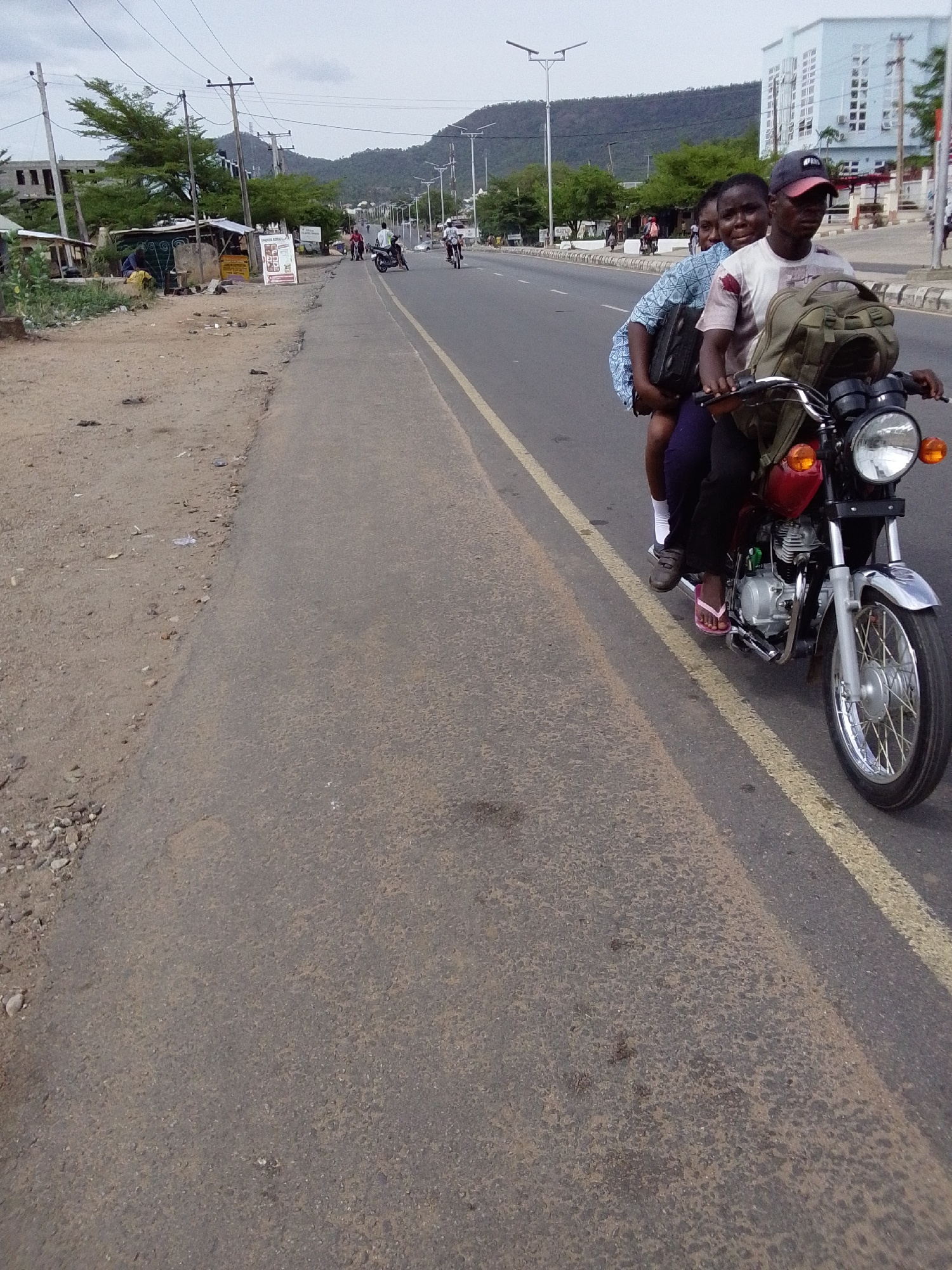 In Adankolo, Nigeria, a man wearing a baseball cap drives a red motorcycle with a large green backpack, carrying a female passenger in a blue and white patterned dress. The motorcycle travels on the r…read more