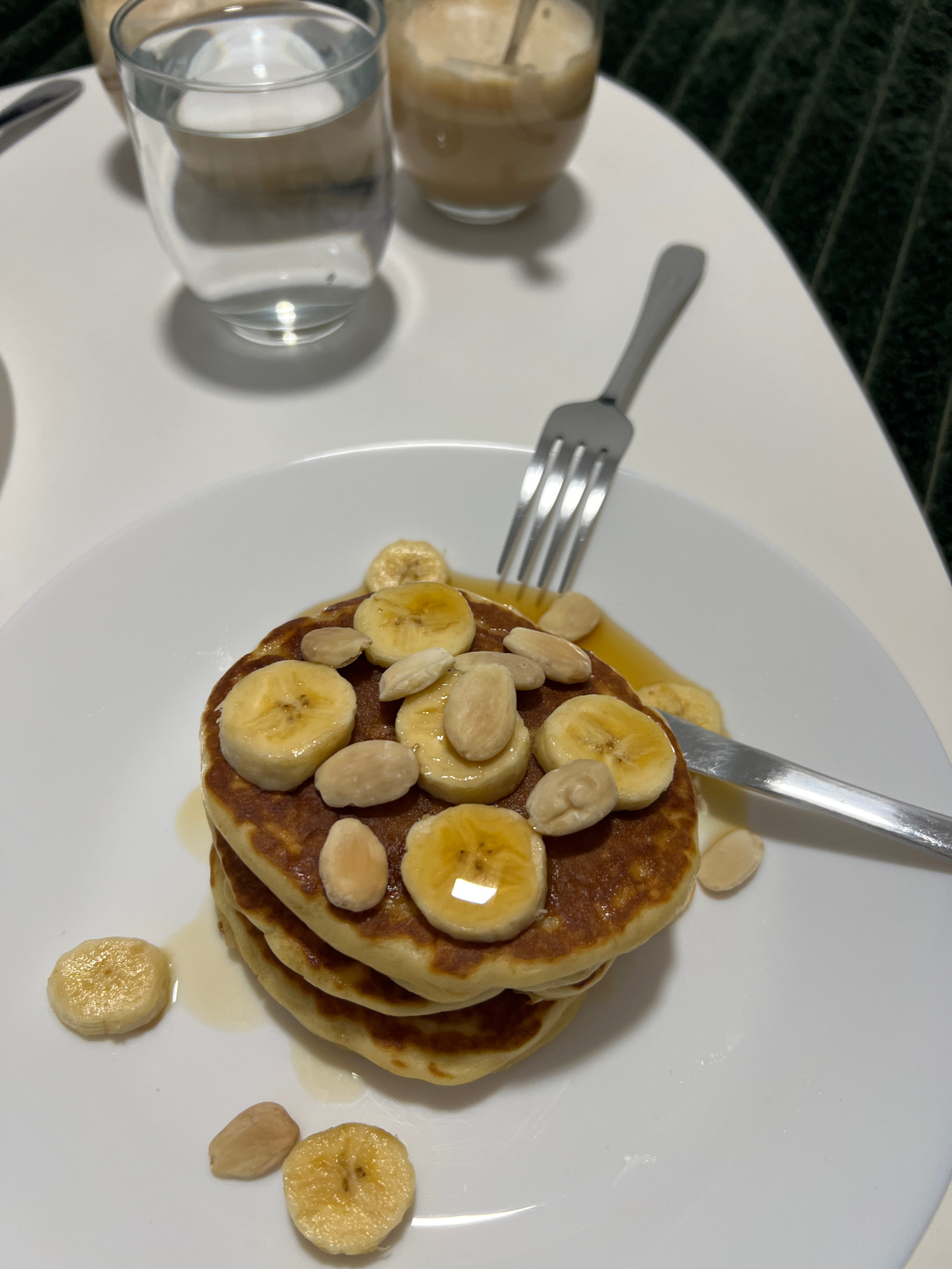 A top-down shot shows a white plate featuring a stack of three pancakes, garnished with banana slices and slivered almonds, drizzled with syrup. A knife and fork rest near the pancakes. Two glasses, o…read more
