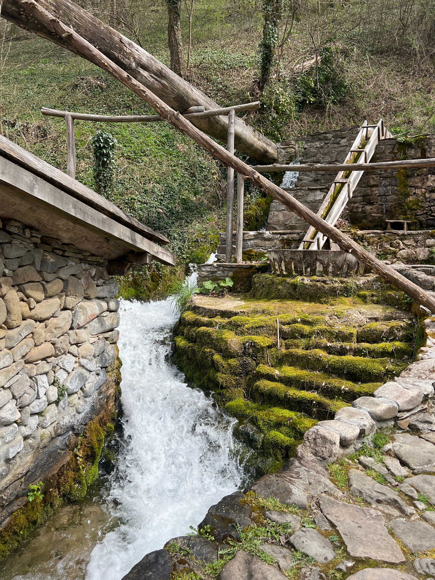 The image depicts a waterfall structure in Gabrovo, Bulgaria. The water cascades over moss-covered stone tiers, leading to a pool below. Wooden support structures and a stone wall with a wooden railin…read more
