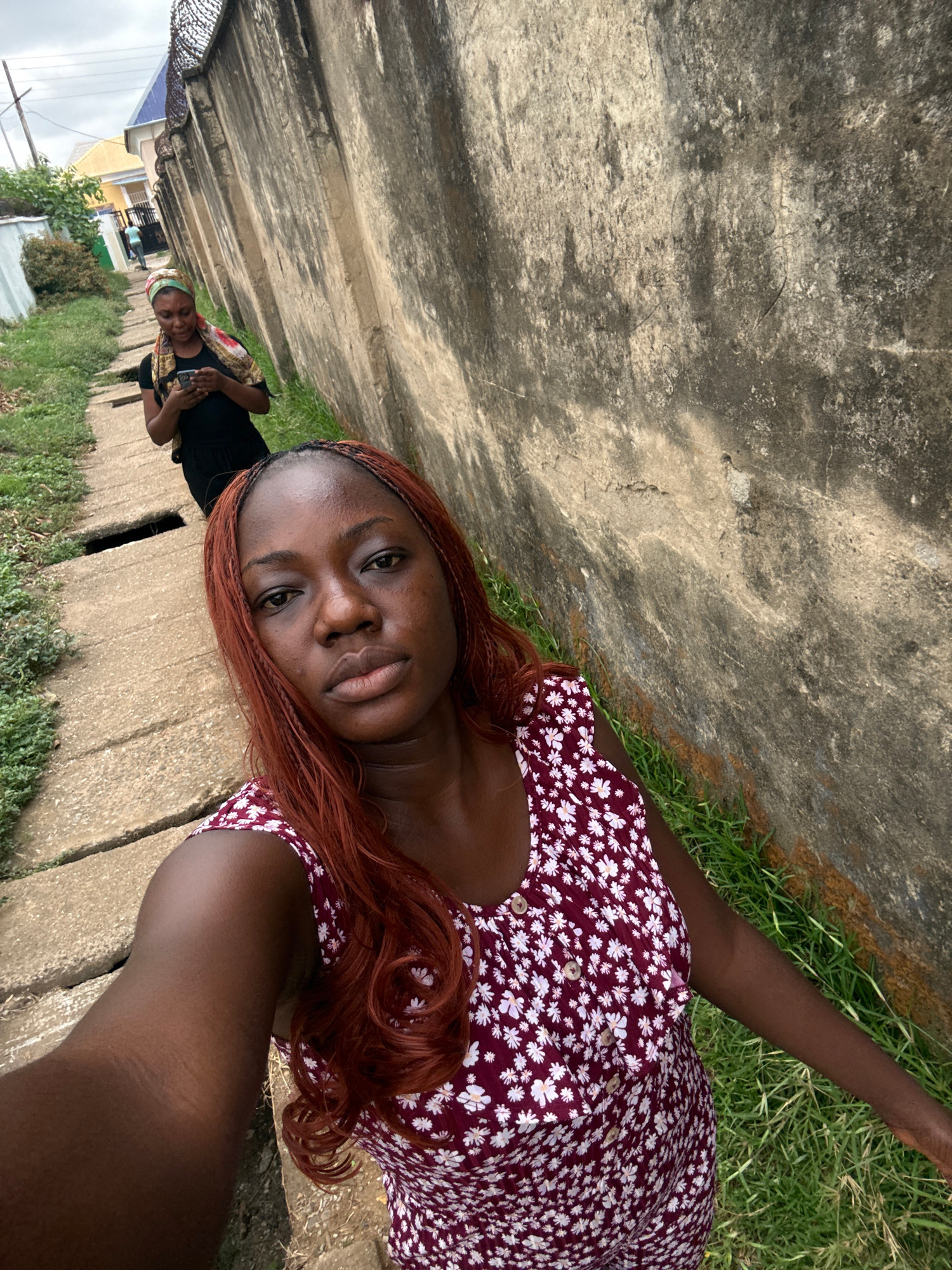 A medium-angle eye-level shot depicts a young woman with brown braided hair in a maroon and white floral print dress, lying on her side outdoors, possibly taking a selfie. A second woman is visible in…read more