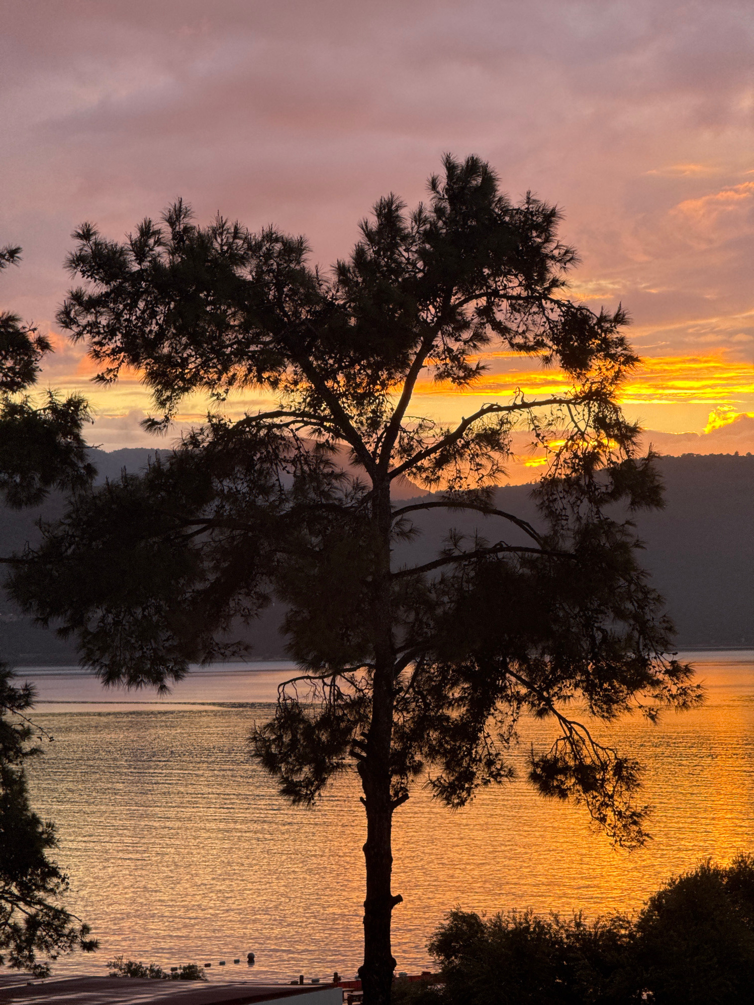 The image depicts a sunset scene in Bodrum, Turkey. A silhouette of a pine tree dominates the foreground, with its branches extending across the frame. In the background, the sky is ablaze with colors…read more